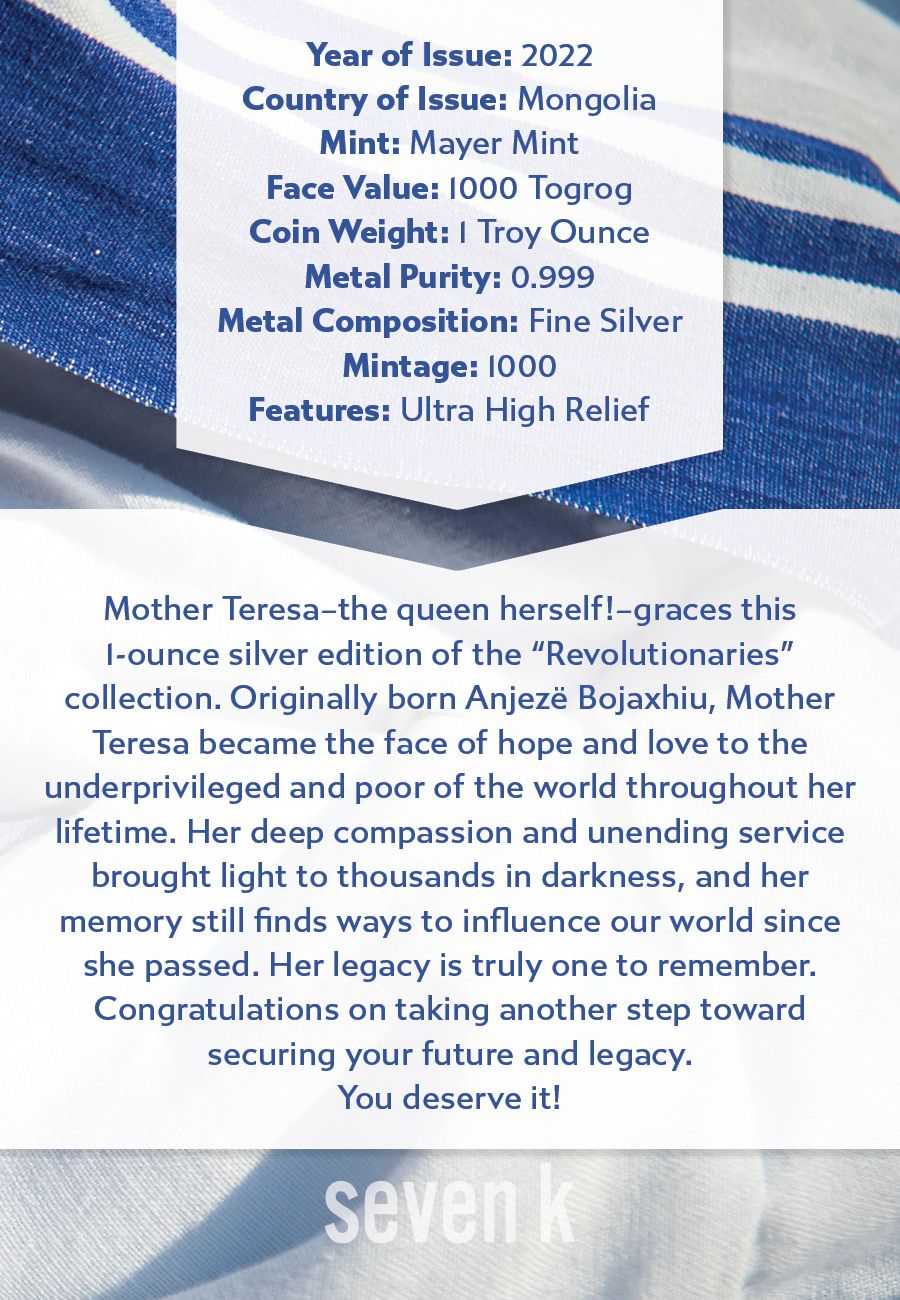 2022 Revolutionaries Mother Theresa 1oz Silver Coin PF70 & PF69