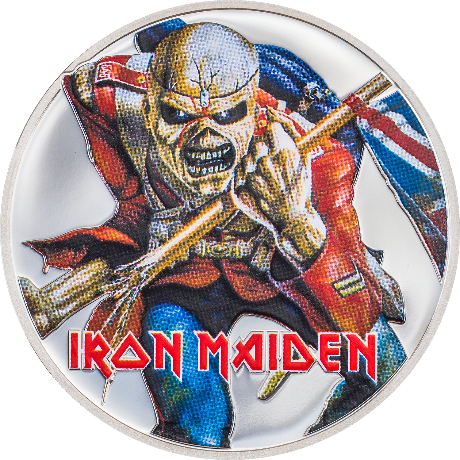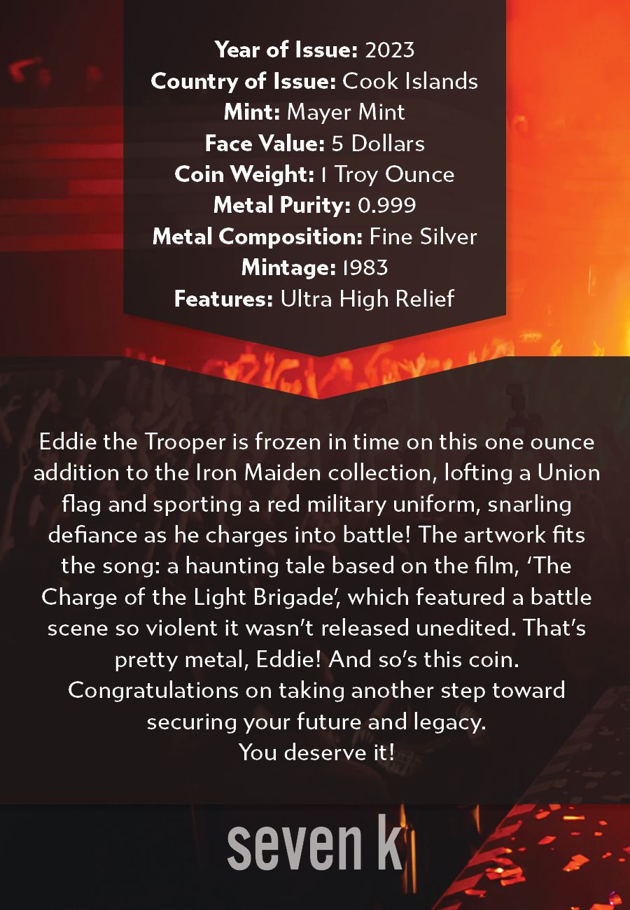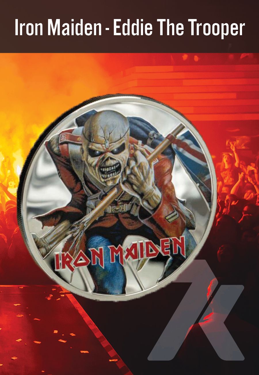 Eddie the Trooper is frozen in time on this one ounce addition to the Iron Maiden collection, lofting a Union flag and sporting a red military uniform, snarling defiance as he charges into battle! The artwork fits the song: a haunting tale based on the film, 'The Charge of the Light Brigade', which featured a battle scene so violent it wasn't released unedited. That's pretty metal, Eddie! And so's this coin.