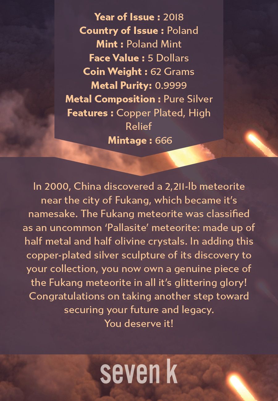 In 2000, China discovered a 2,211-lb meteorite near the city of Fukang, which became it's namesake. The Fukang meteorite was classified as an uncommon 'Pallasite' meteorite: made up of half metal and half olivine crystals. In adding this copper-plated silver sculpture of its discovery to your collection, you now own a genuine piece of the Fukang meteorite in all it's glittering glory!