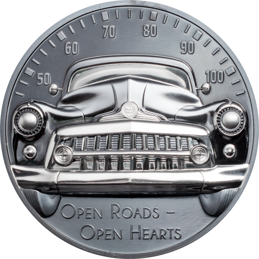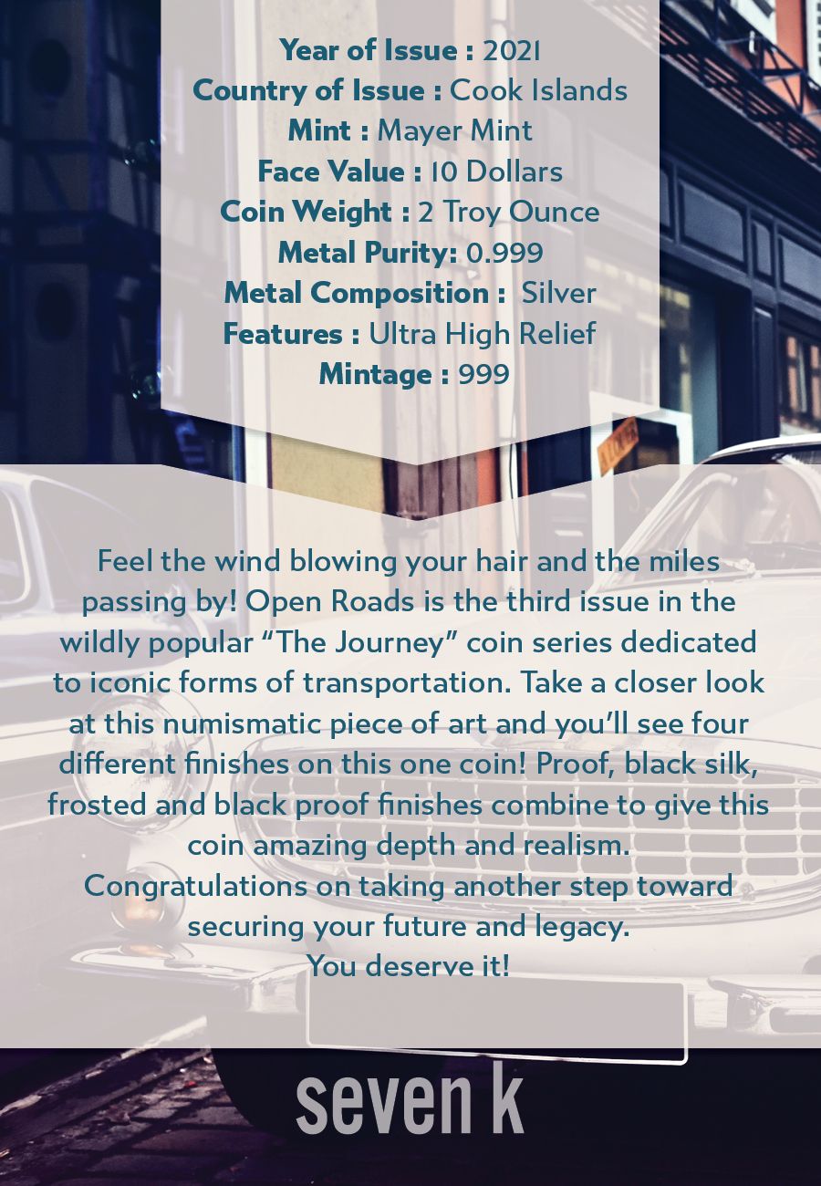 Feel the wind blowing your hair and the miles passing by! Open Roads is the third issue in the wildly popular “The Journey” coin series dedicated to iconic forms of transportation. Take a closer look at this numismatic piece of art and you’ll see four different finishes on this one coin! Proof, black silk, frosted and black proof finishes combine to give this coin amazing depth and realism.