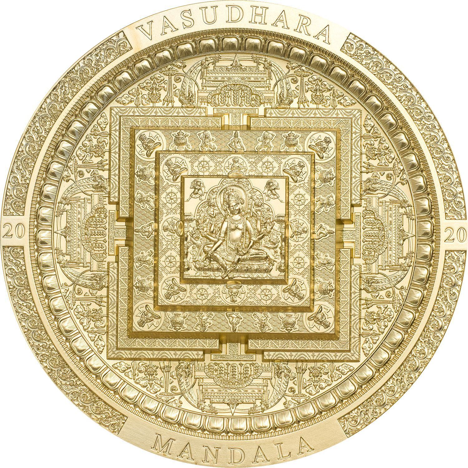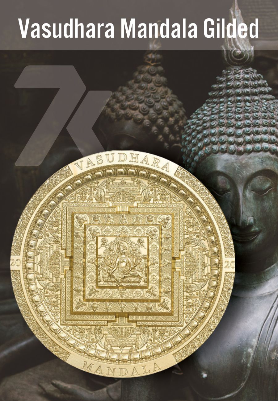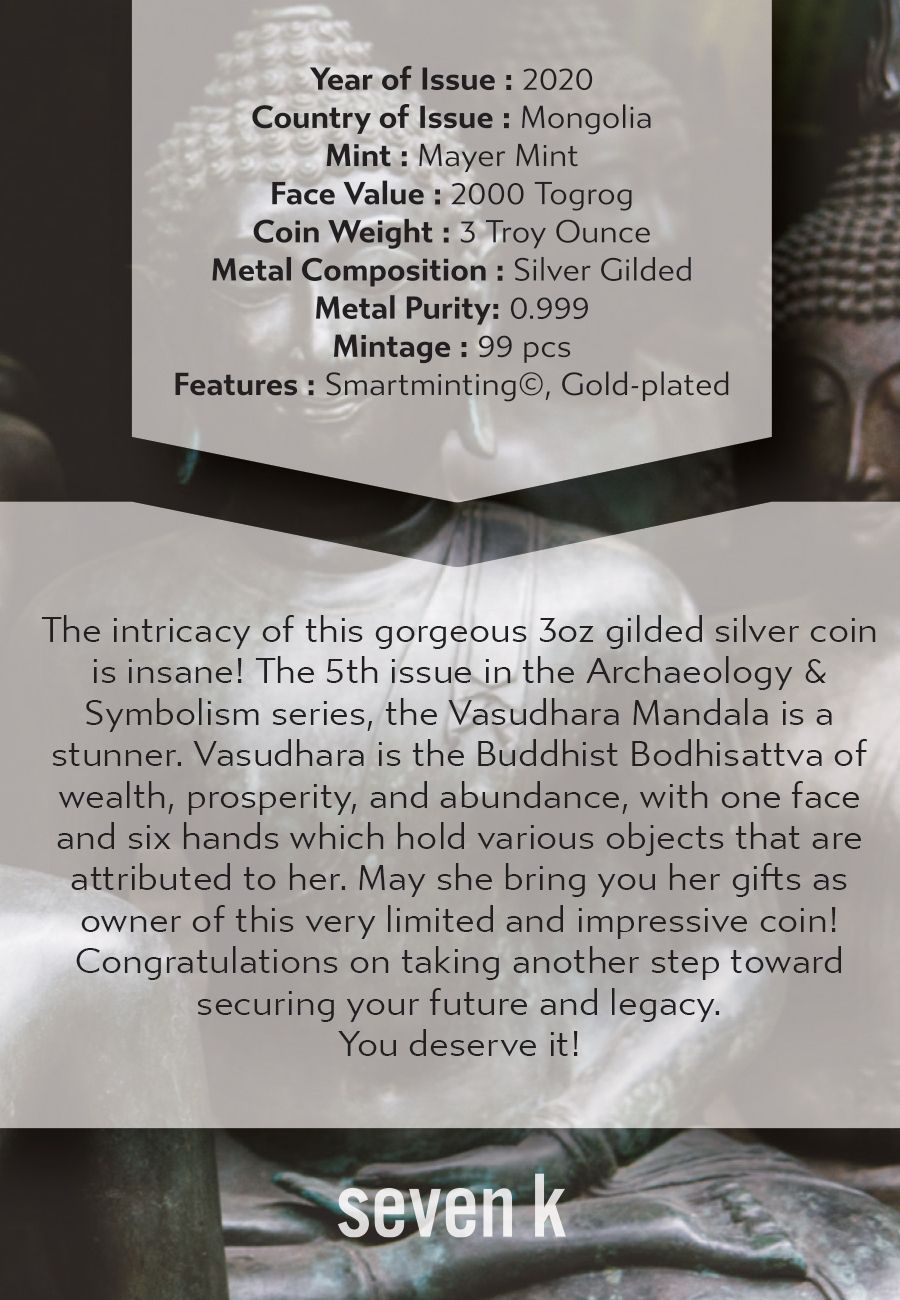 The intricacy of this gorgeous 3oz gilded silver coin is insane! The 5th issue in the Archaeology & Symbolism series, the Vasudhara Mandala is a stunner. Vasudhara is the Buddhist Bodhisattva of wealth, prosperity, and abundance, with one face and six hands which hold various objects that are attributed to her. May she bring you her gifts as owner of this very limited and impressive coin!