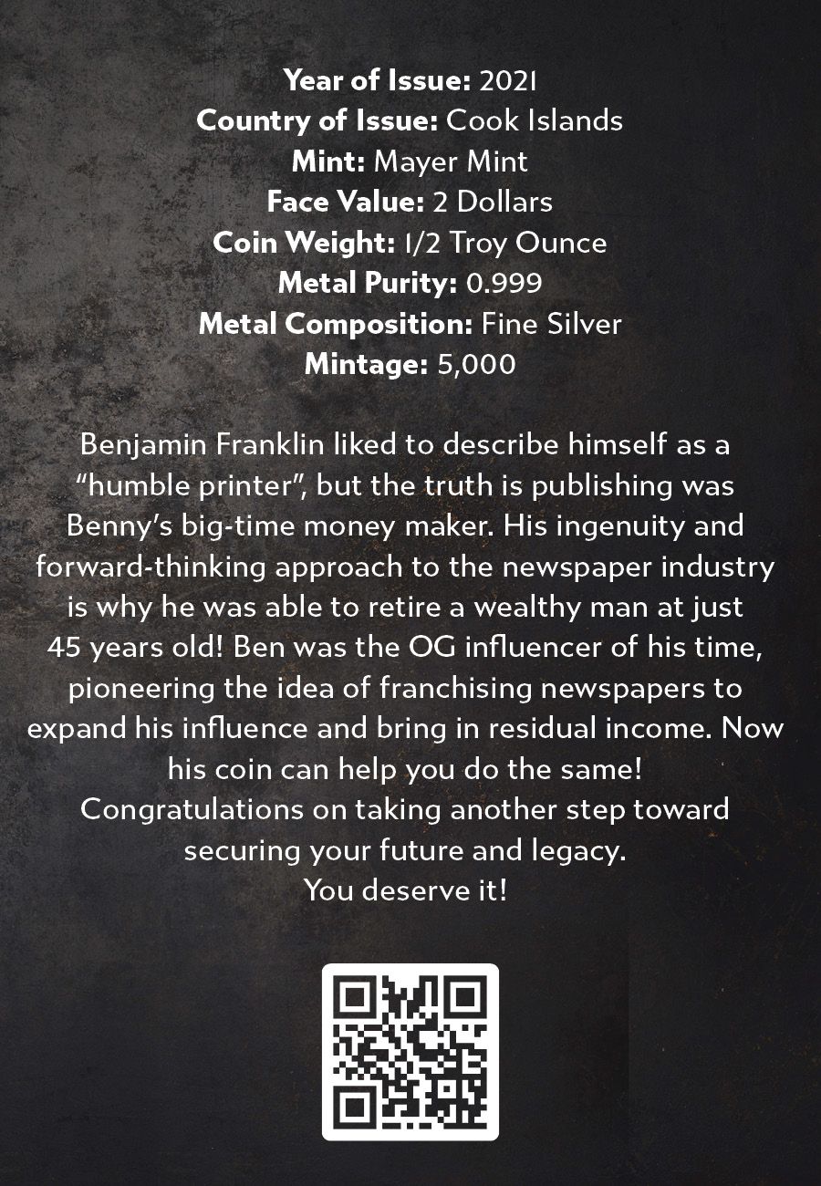 Benjamin Franklin liked to describe himself as a “humble printer”, but the truth is publishing was Benny’s big-time money maker. His ingenuity and forward-thinking approach to the newspaper industry is why he was able to retire a wealthy man at just 45 years old! Ben was the OG influencer of his time, pioneering the idea of franchising newspapers to expand his influence and bring in residual income. Now his coin can help you do the same!