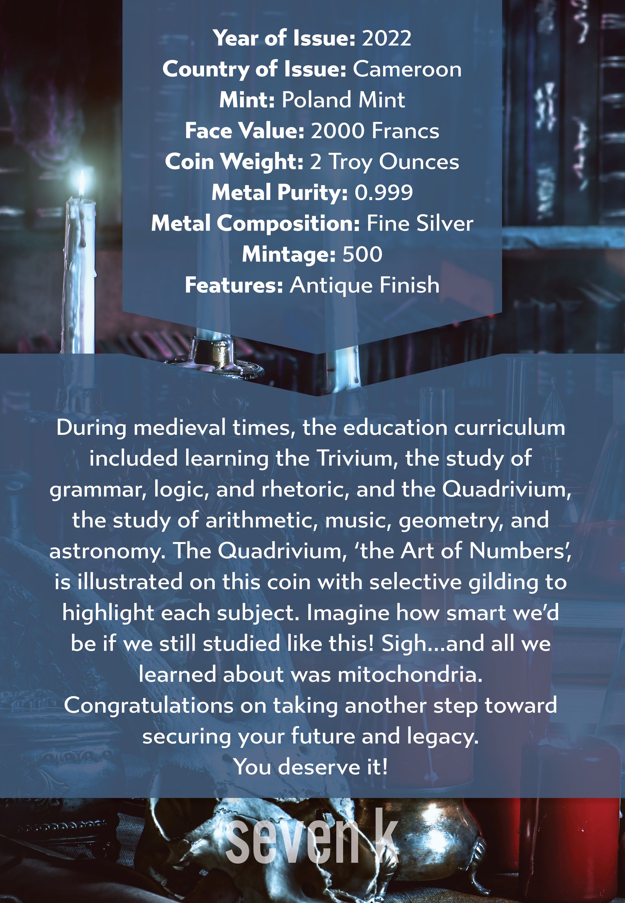 During medieval times, the education curriculum included learning the Trivium, the study of grammar, logic, and rhetoric, and the Quadrivium, the study of arithmetic, music, geometry, and astronomy. The Quadrivium, 'the Art of Numbers', is illustrated on this coin with selective gilding to highlight each subject. Imagine how smart we'd be if we still studied like this! Sigh...and all we learned about was mitochondria.