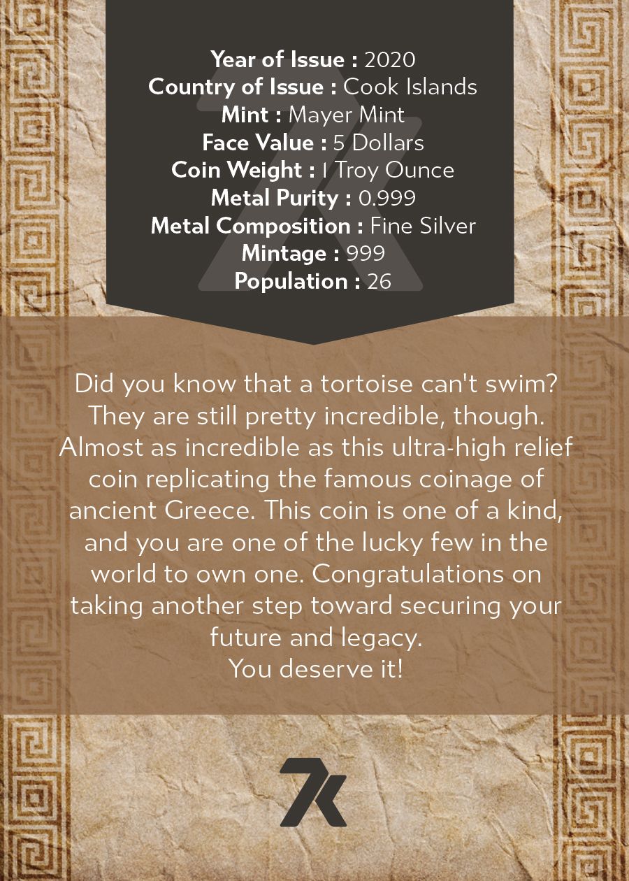 Did you know that a tortoise can't swim? They are still pretty incredible, though. Almost as incredible as this ultra-high relief coin replicating the famous coinage of ancient Greece. This coin is one of a kind, and you are one of the lucky few in the world to own one.