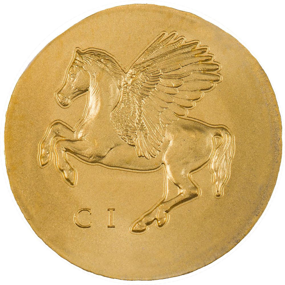 The Pegasos: a popular Numismatic Icon in ancient Greece originating from the island of Corinth around the seventh century BC. The Corinthian people believed Pegasos was tamed in their city by their hero, Bellerophon, when the goddess Athena created a saddle to allow him to ride the mighty equine into battle against the Chimera and prevail. This 1-oz silver reproduction of those early Pegasos coins rivals the magnificence of the ancient originals.