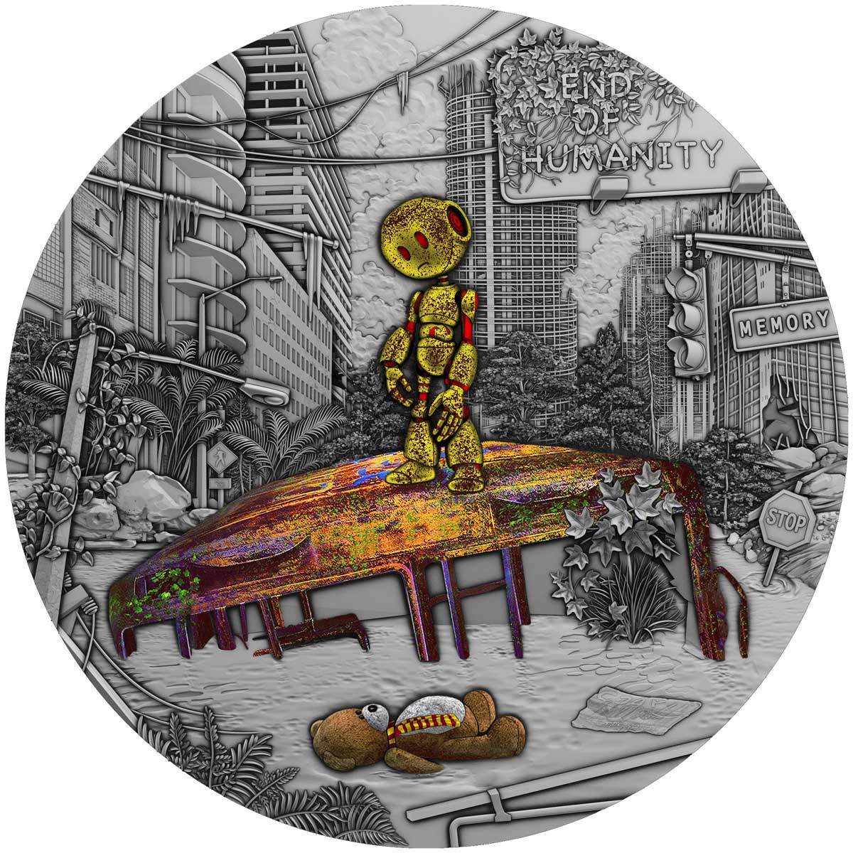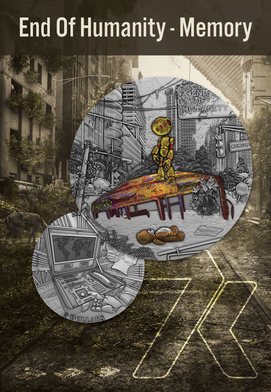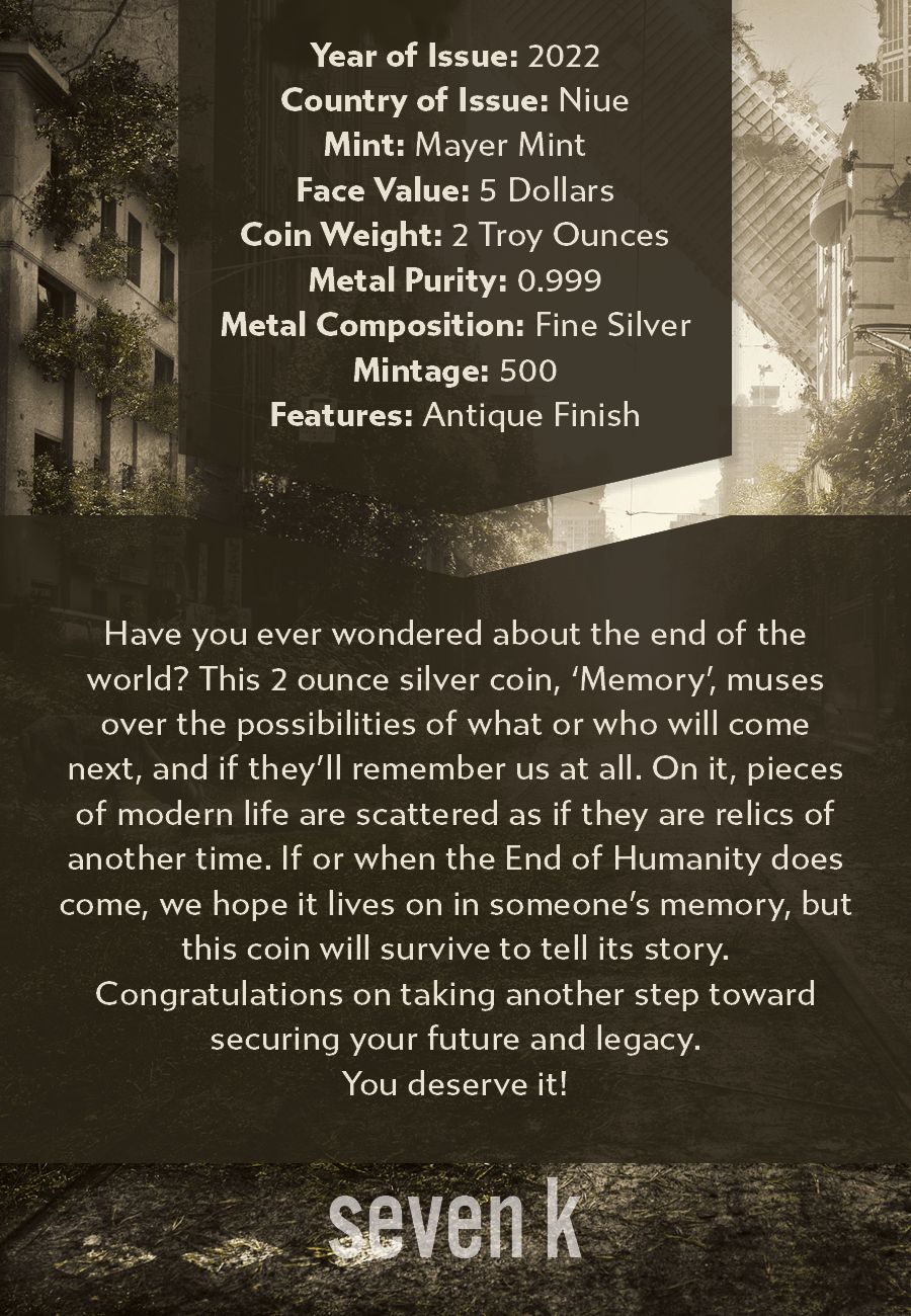 Have you ever wondered about the end of the world? This 2 ounce silver coin, 'Memory', muses over the possibilities of what or who will come next, and if they'll remember us at all. On it, pieces of modern life are scattered as if they are relics of another time. If or when the End of Humanity does come, we hope it lives on in someone's memory, but this coin will survive to tell its story.