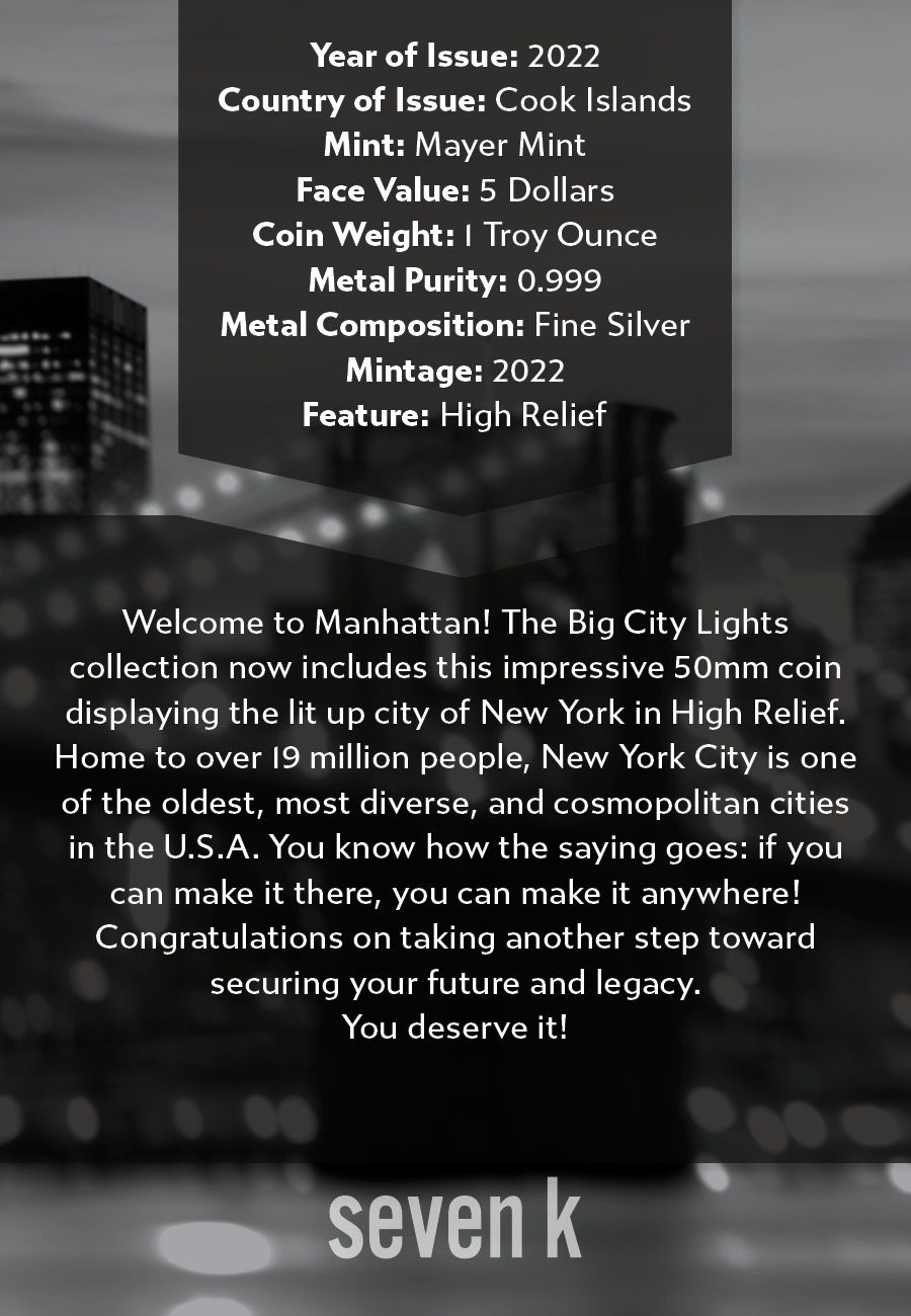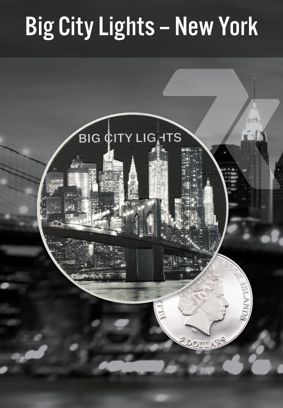 Welcome to Manhattan! The Big City Lights collection now includes this impressive 50mm coin displaying the lit up city of New York in High Relief. Home to over 19 million people, New York City is one of the oldest, most diverse, and cosmopolitan cities in the U.S.A. You know how the saying goes: if you can make it there, you can make it anywhere!