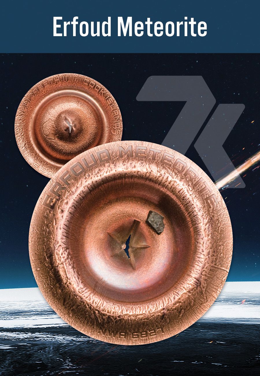 A touchdown in the Moroccan Desert led to the discovery, recovery, and finally, the placement of the Erfoud Meteorite into the very coin you now hold! The ever-growing Meteorite collection just gets cooler and cooler with every addition. This one utilizes shape, color, and a genuine piece of meteorite to tell the story of the Erfoud Meteorite's surprise trip to Earth.