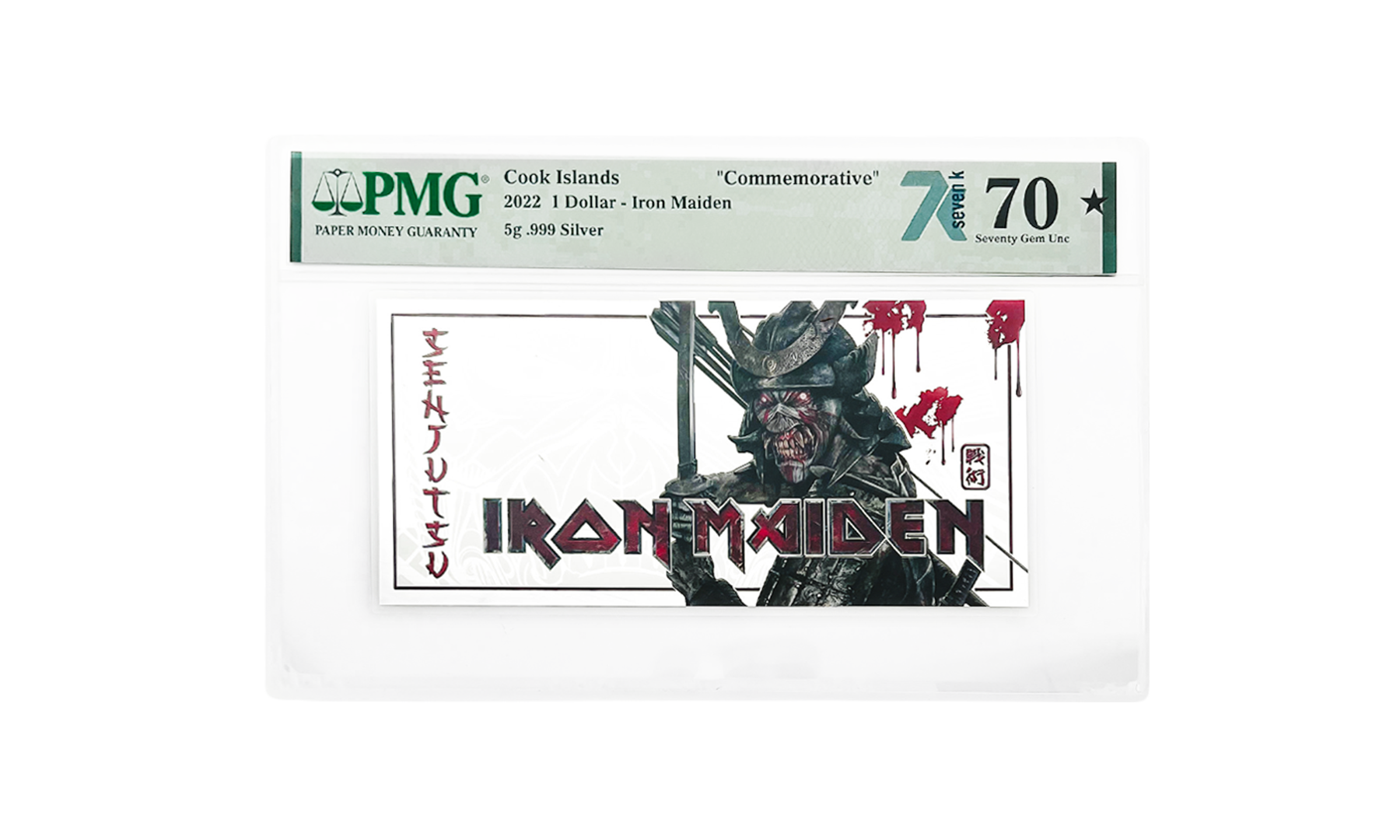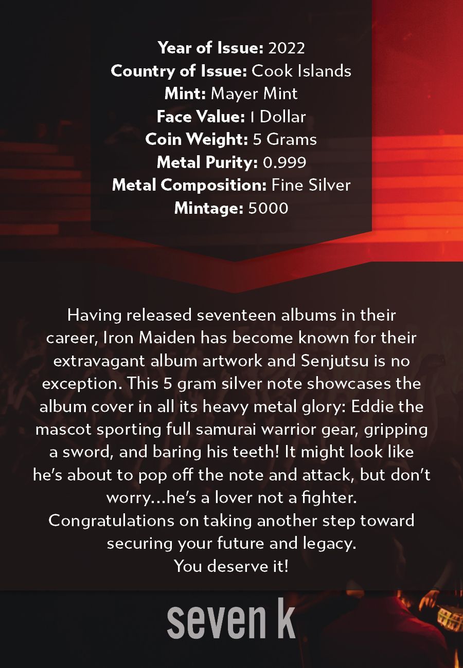 Having released seventeen albums in their career, Iron Maiden has become known for their extravagant album artwork and Senjutsu is no exception. This 5 gram silver note showcases the album cover in all its heavy metal glory: Eddie the mascot sporting full samurai warrior gear, gripping a sword, and baring his teeth! It might look like he's about to pop off the note and attack, but don’t worry…he’s a lover not a fighter.