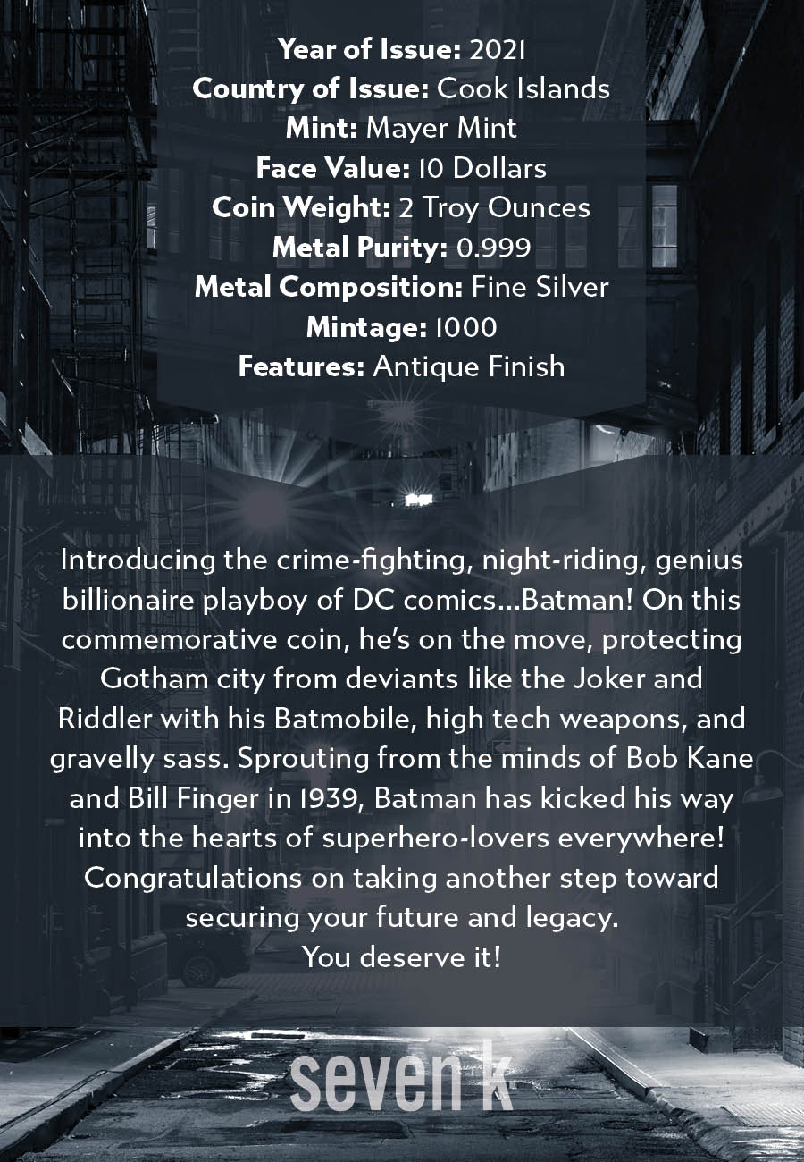 Introducing the crime-fighting, night-riding, genius billionaire playboy of DC comics...Batman! On this commemorative coin, he's on the move, protecting Gotham city from deviants like the Joker and Riddler with his Batmobile, high tech weapons, and gravelly sass. Sprouting from the minds of Bob Kane and Bill Finger in 1939, Batman has kicked his way into the hearts of superhero-lovers everywhere!