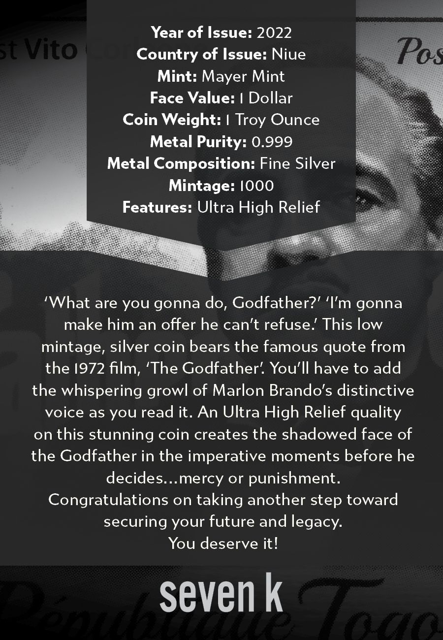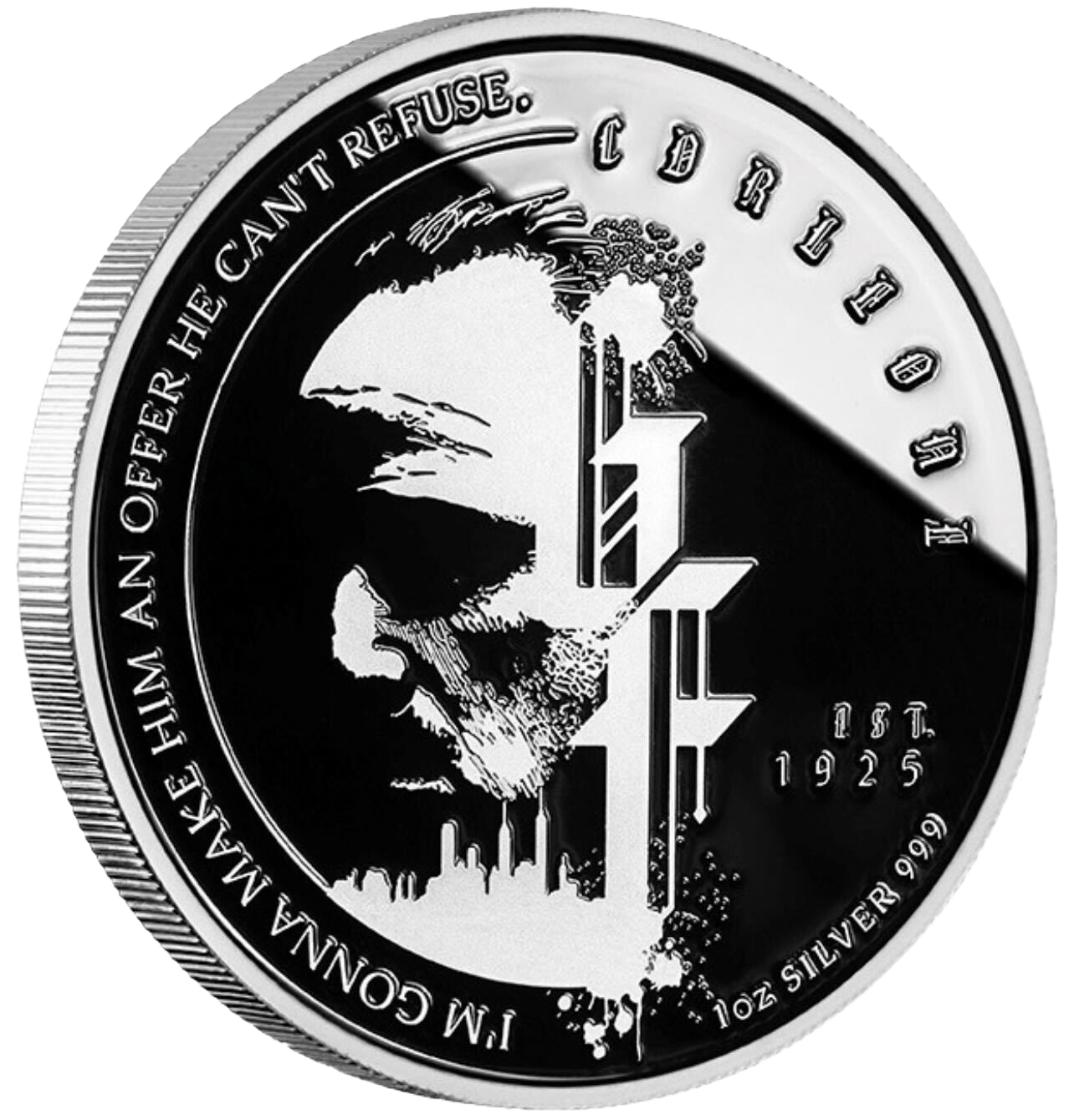 'What are you gonna do, Godfather?' 'I'm gonna make him an offer he can't refuse.' This low mintage, silver coin bears the famous quote from the 1972 film, 'The Godfather'. You'll have to add the whispering growl of Marlon Brando's distinctive voice as you read it. An Ultra High Relief quality on this stunning coin creates the shadowed face of the Godfather in the imperative moments before he decides…mercy or punishment.