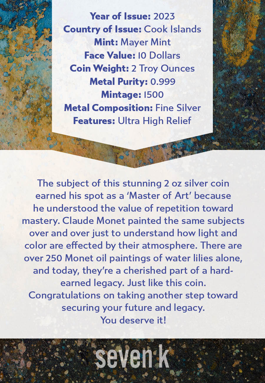 The subject of this stunning 2 oz silver coin earned his spot as a ‘Master of Art’ because he understood the value of repetition toward mastery. Claude Monet painted the same subjects over and over just to understand how light and color are effected by their atmosphere. There are over 250 Monet oil paintings of water lilies alone, and today, they’re a cherished part of a hard-earned legacy. Just like this coin.