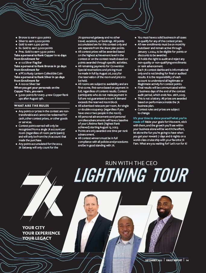 - Top 11-20 point-winners - earn a corporate-sponsored Lightning Tour Event, attended by one of our awesome corporate representatives, like a 7k Founder, Chief of Sales and Marketing Mr. Blake Davis, or one of our co-Directors of Field Development, Mr. Timothy Schmalbeck or Mr. Benny Kofe.