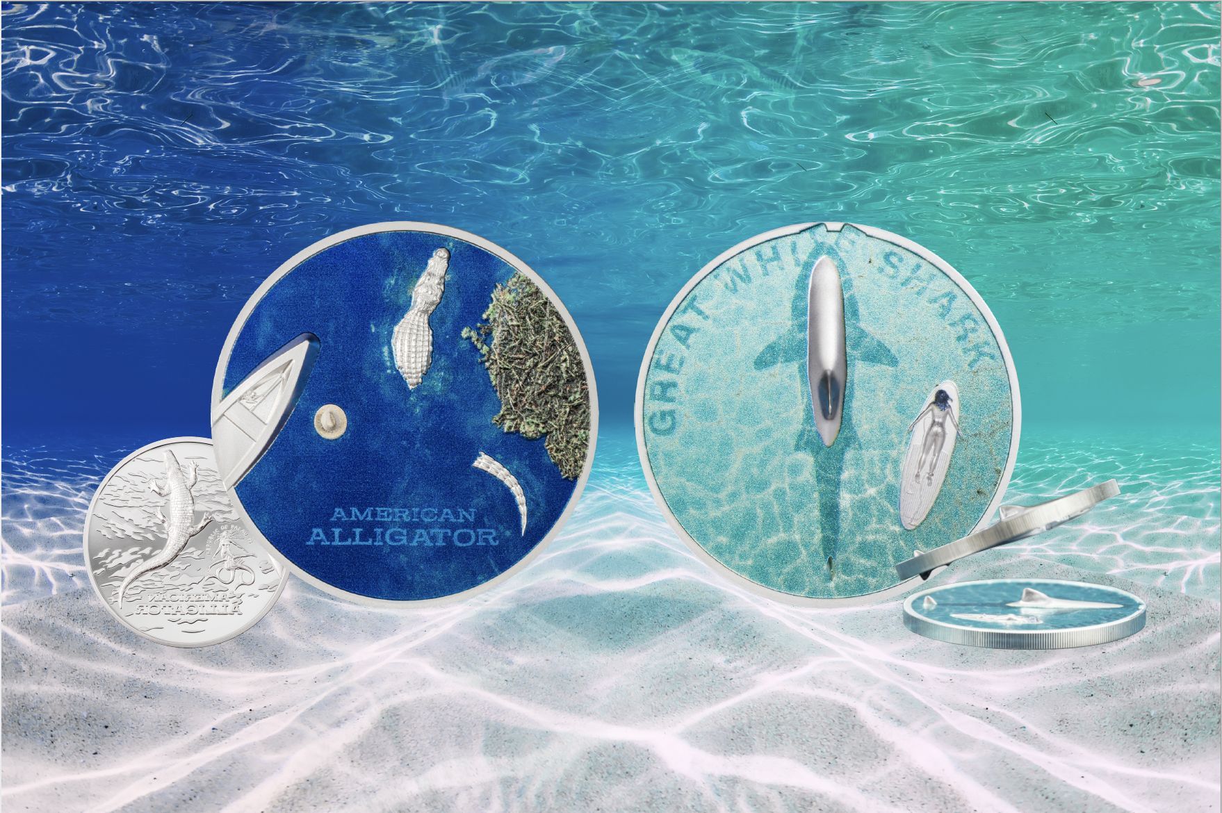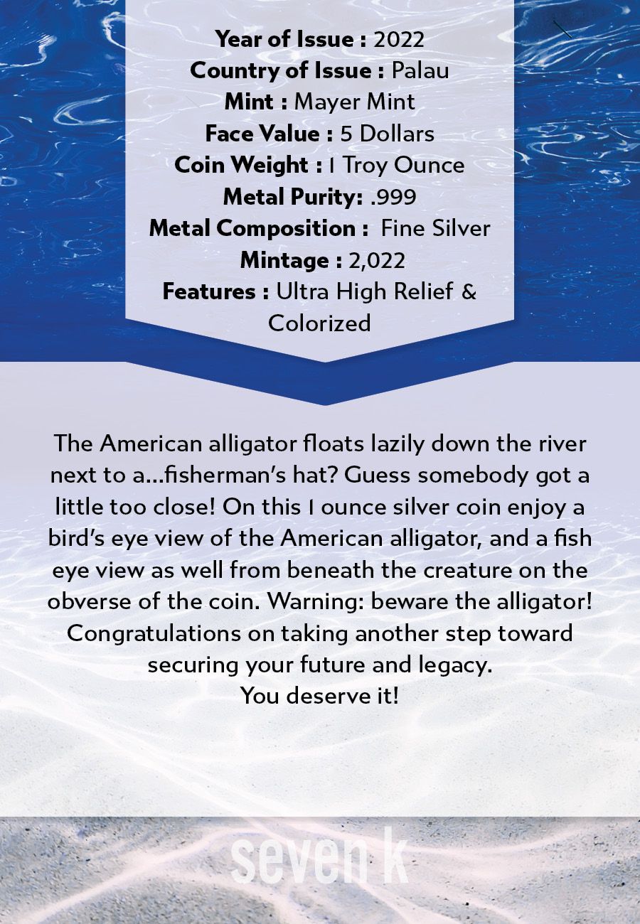 The American alligator floats lazily down the river next to a...fisherman's hat? Guess somebody got a little too close! On this 1 ounce silver coin enjoy a bird's eye view of the American alligator, and a fish eye view as well from beneath the creature on the obverse of the coin. Warning: beware the alligator!