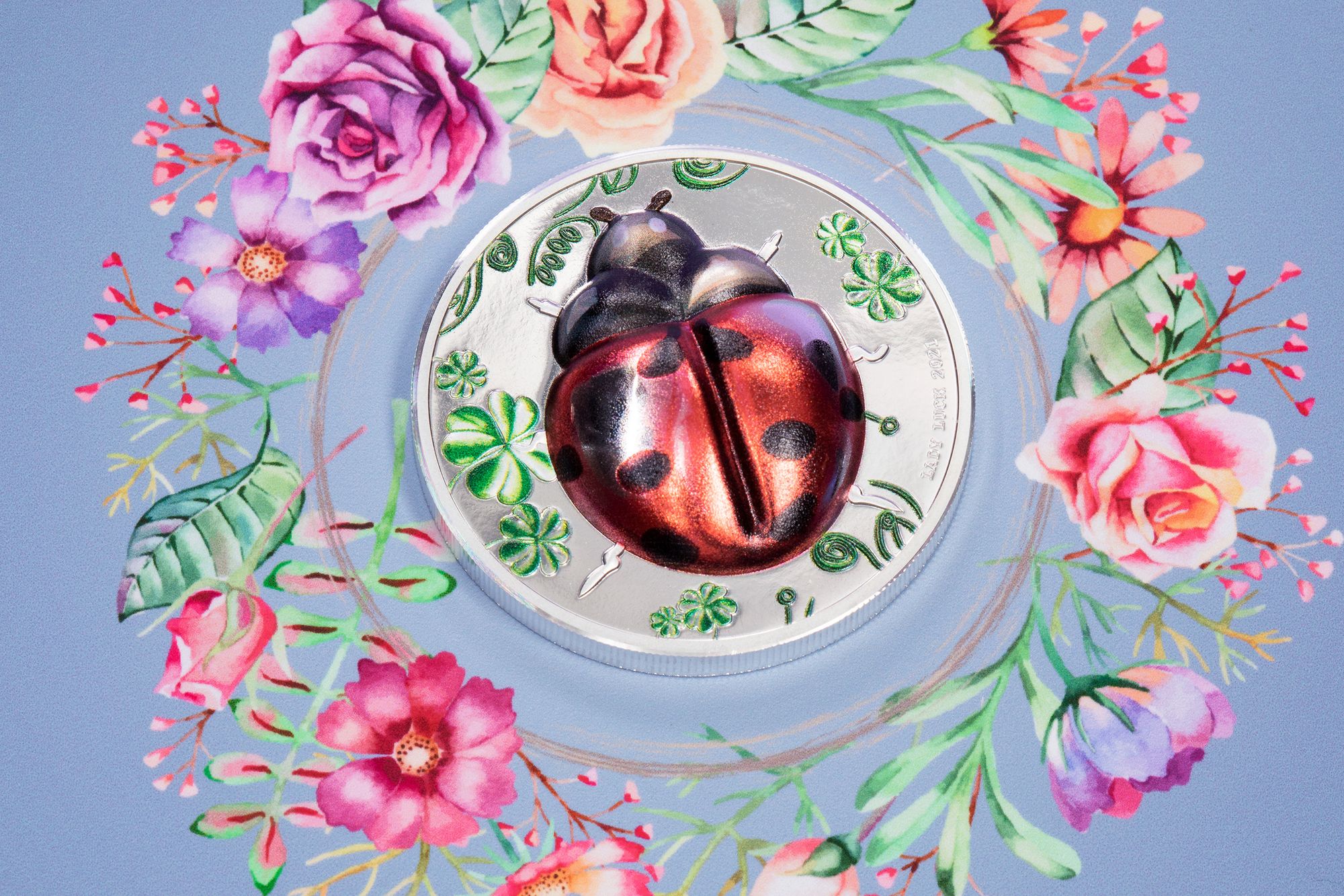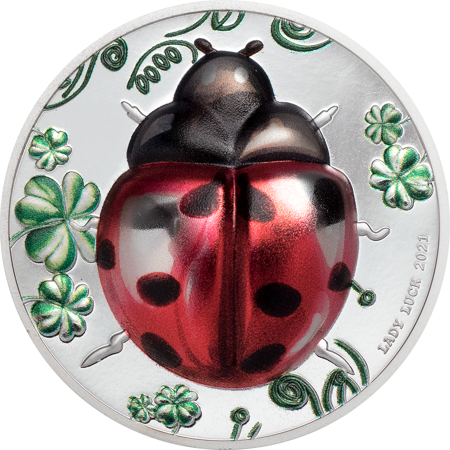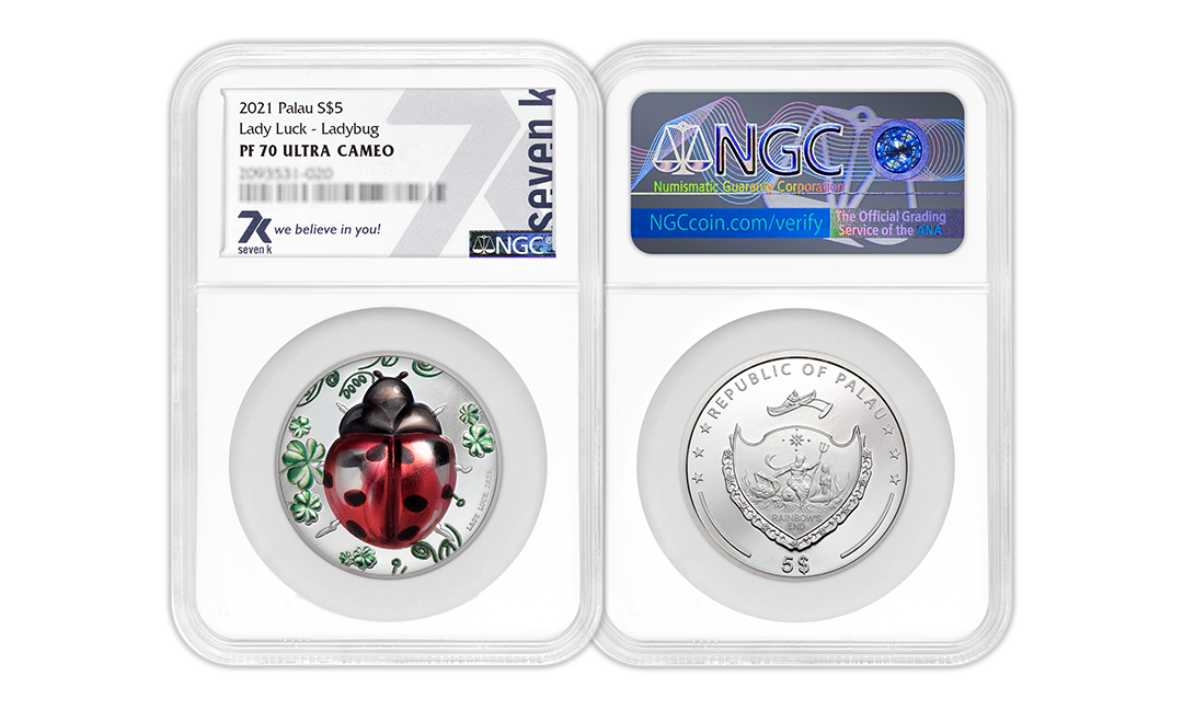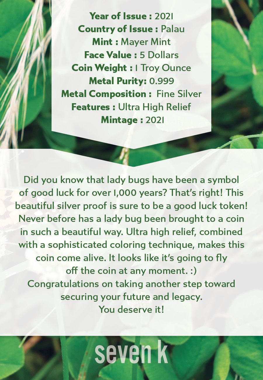 Did you know that lady bugs have been a symbol of good luck for over 1,000 years? That's right! This beautiful silver proof is sure to be a good luck token! Never before has a lady bug been brought to a coin in such a beautiful way. Ultra high relief, combined with a sophisticated coloring technique, makes this coin come alive. It looks like it's going to fly off the coin at any moment.
