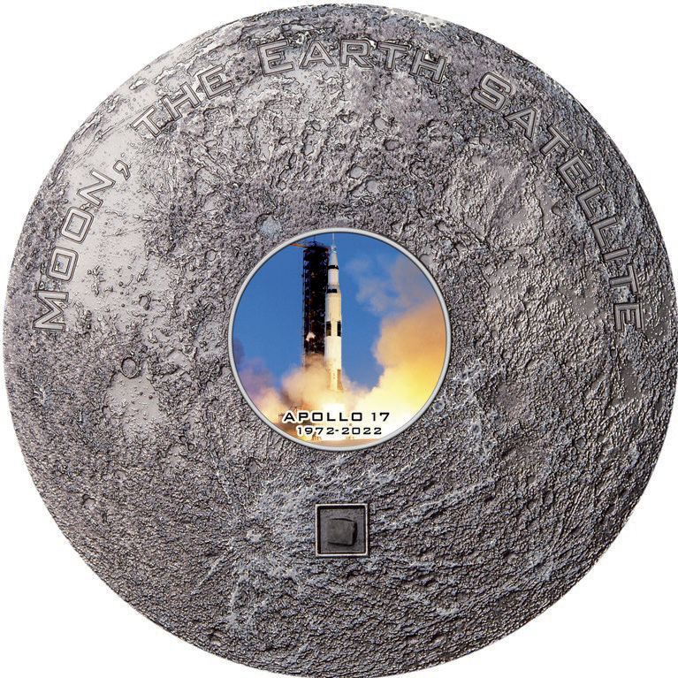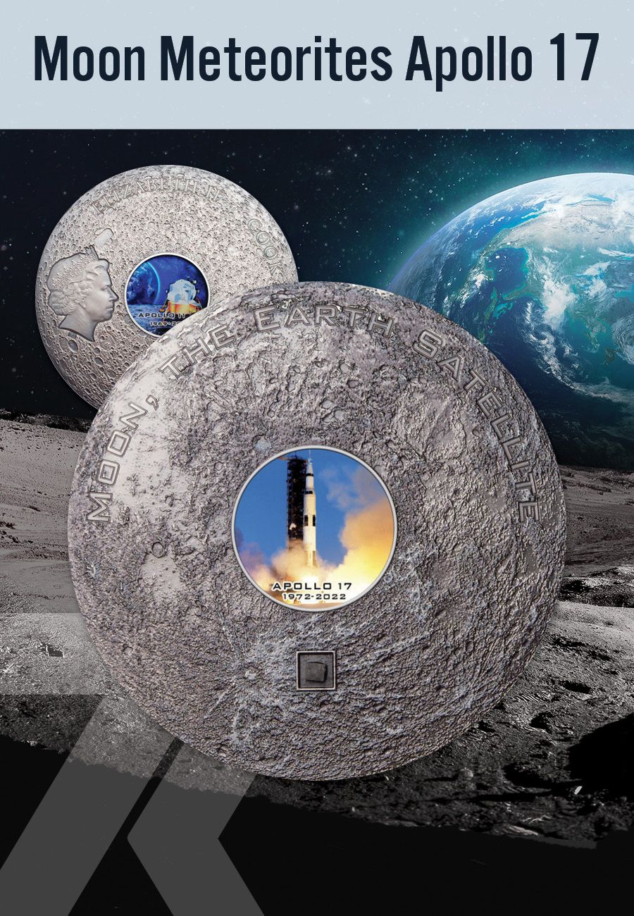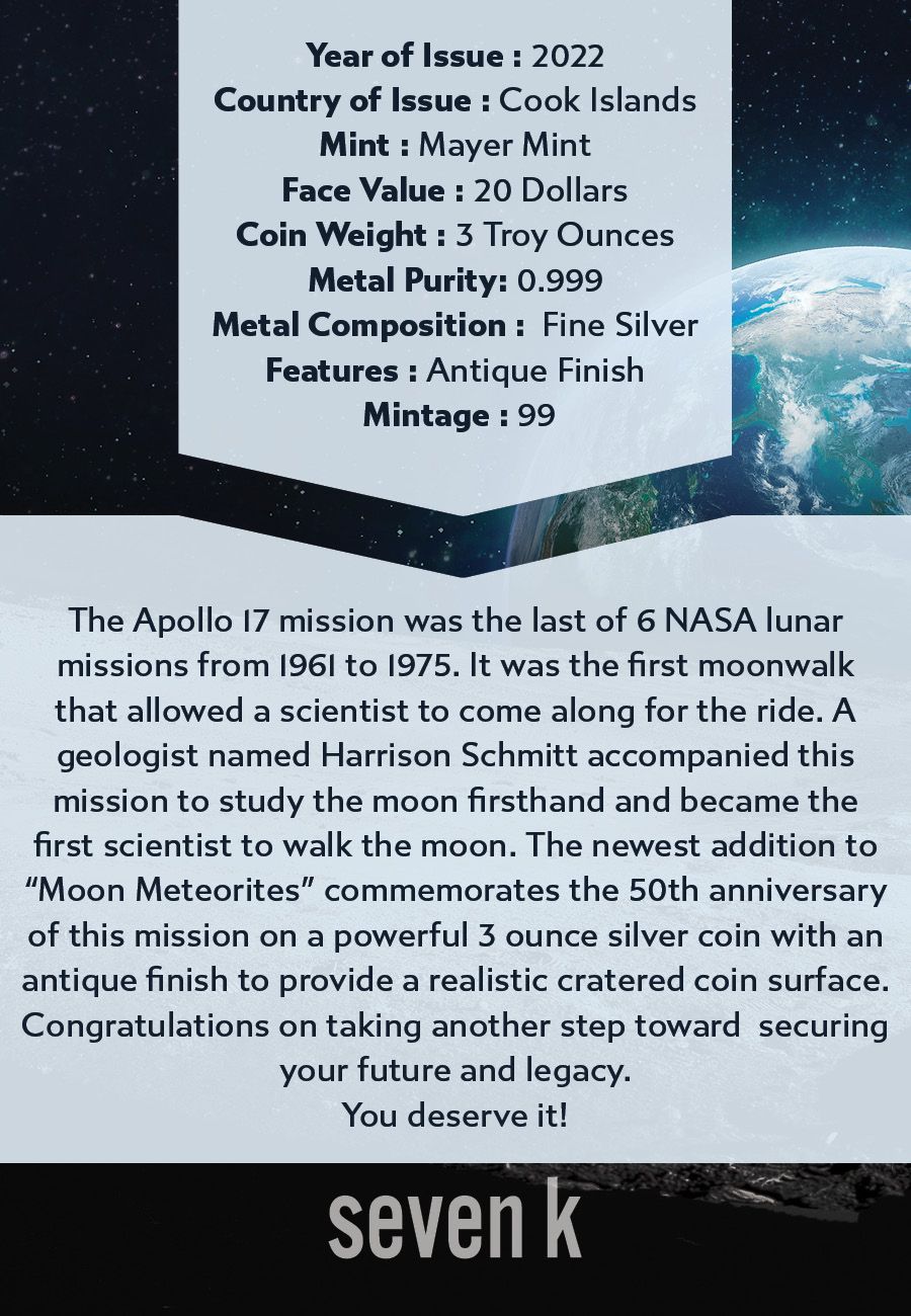 The Apollo 17 mission was the last of 6 NASA lunar missions from 1961 to 1975. It was the first moonwalk that allowed a scientist to come along for the ride. A geologist named Harrison Schmitt accompanied this mission to study the moon firsthand and became the first scientist to walk the moon. The newest addition to "Moon Meteorites" commemorates the 50th anniversary of this mission on a powerful 3 ounce silver coin with an antique finish to provide a realistic cratered coin surface.