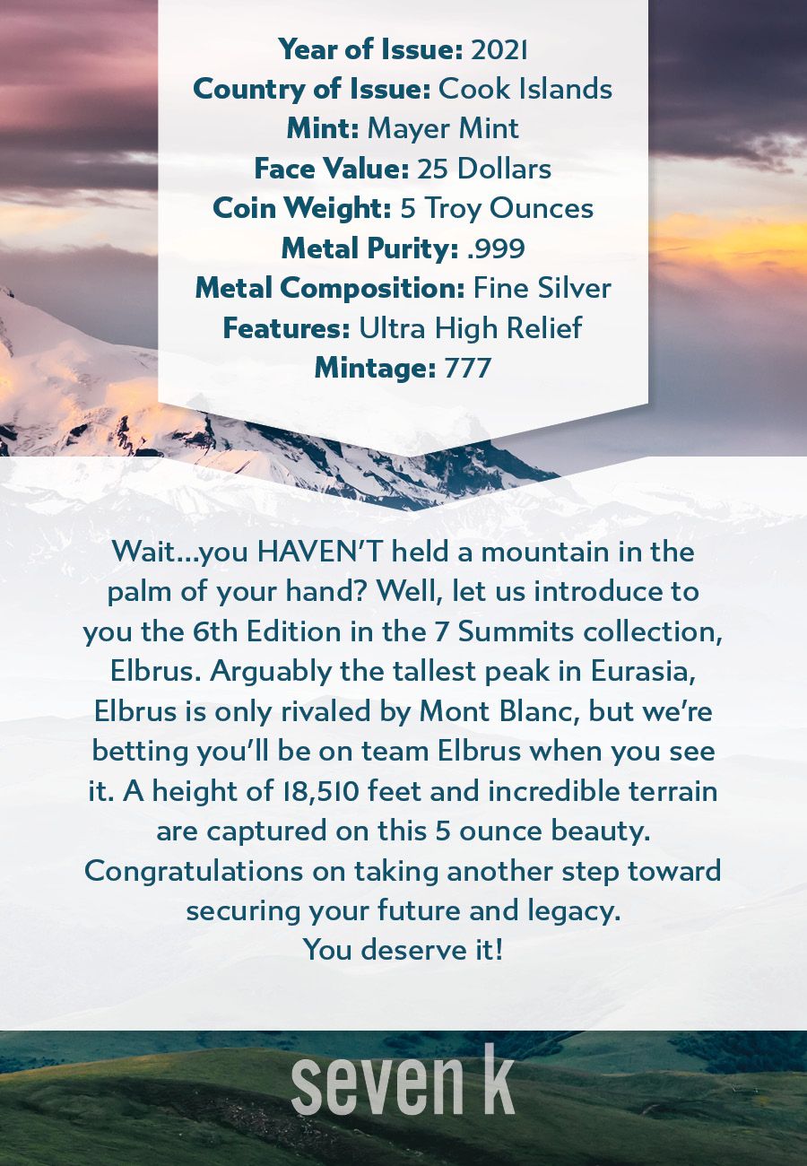 2021 The 7 Summits Elbrus 5oz Silver Coin MS69 & MS70