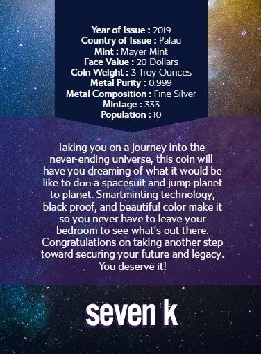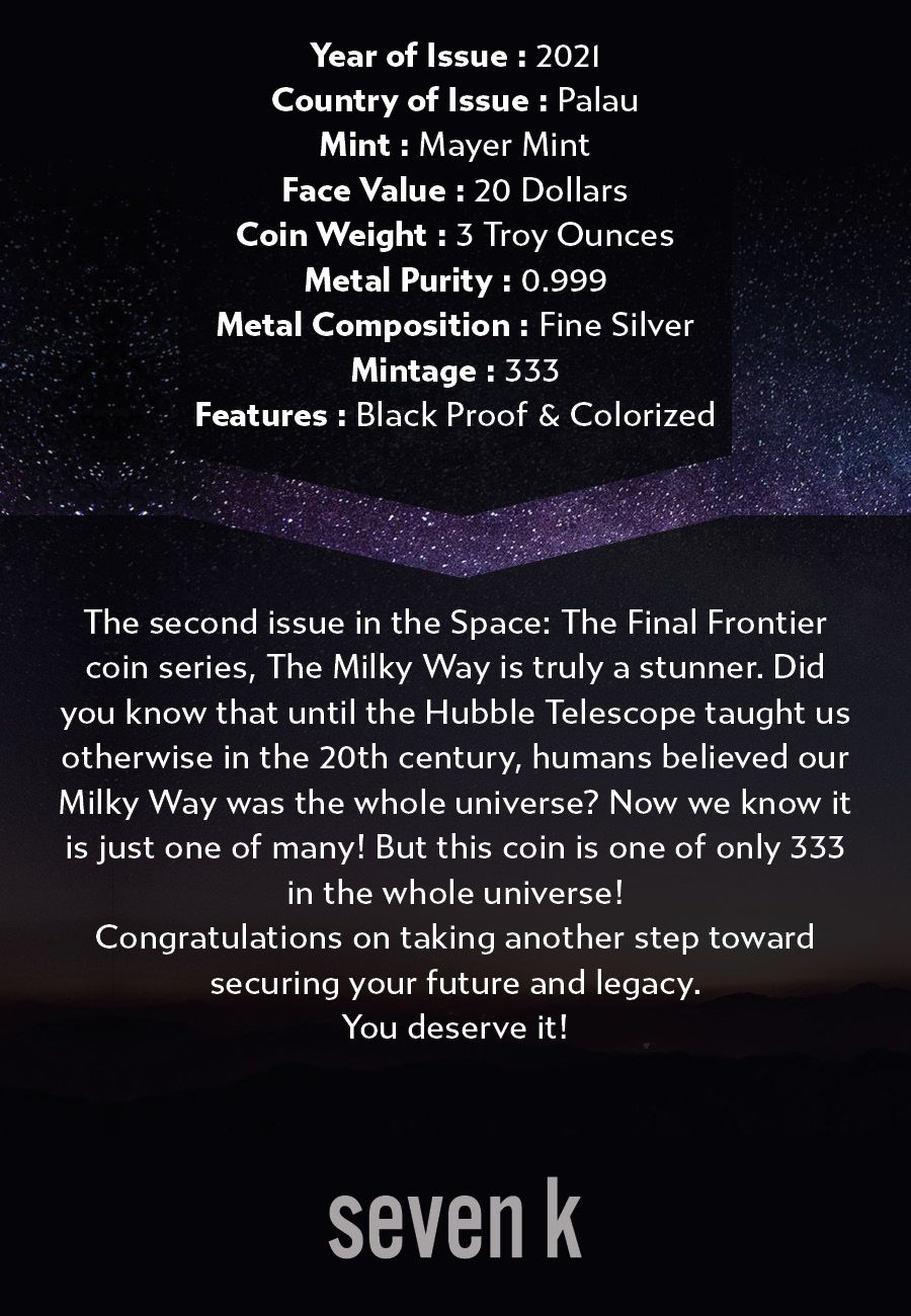 The second issue in the Space: The Final Frontier coin series, The Milky Way is truly a stunner. Did you know that until the Hubble Telescope taught us otherwise in the 20th century, humans believed our Milky Way was the whole universe? Now we know it is just one of many! But this coin is one of only 333 in the whole universe!