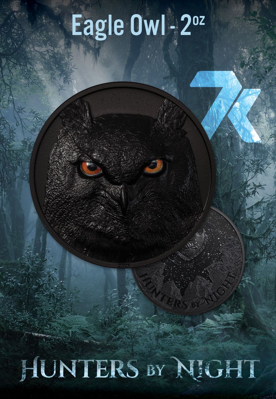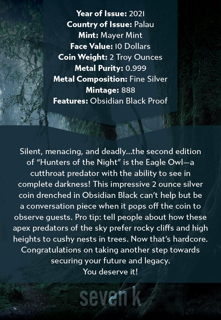 2022 Hunters By Night Eagle Owl 2oz Black Obsidian Silver Coin PF70 & PF69