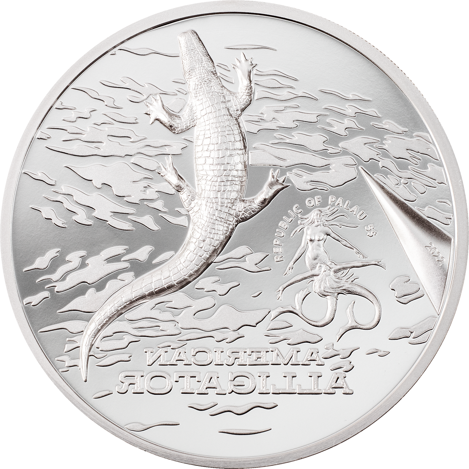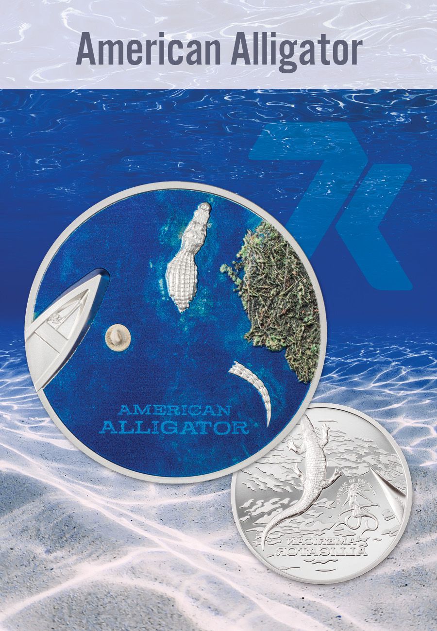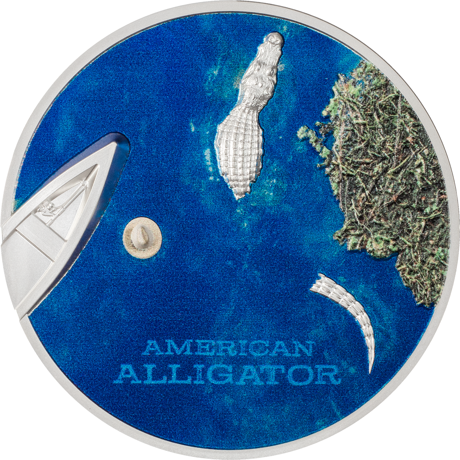 The American alligator floats lazily down the river next to a...fisherman's hat? Guess somebody got a little too close! On this 1 ounce silver coin enjoy a bird's eye view of the American alligator, and a fish eye view as well from beneath the creature on the obverse of the coin. Warning: beware the alligator!
