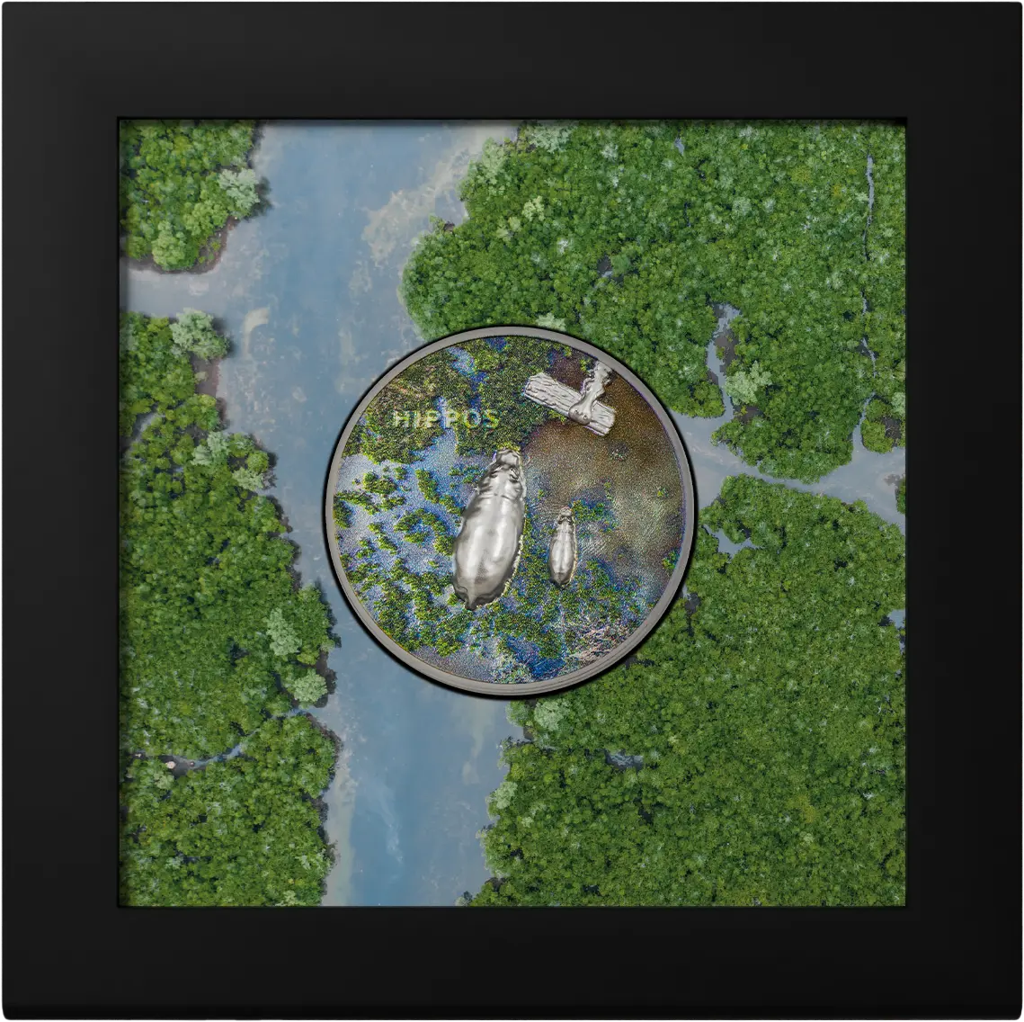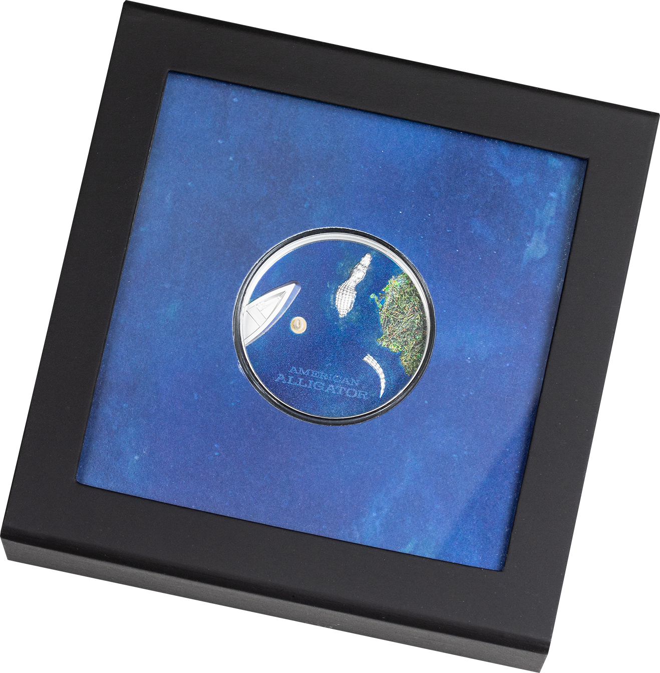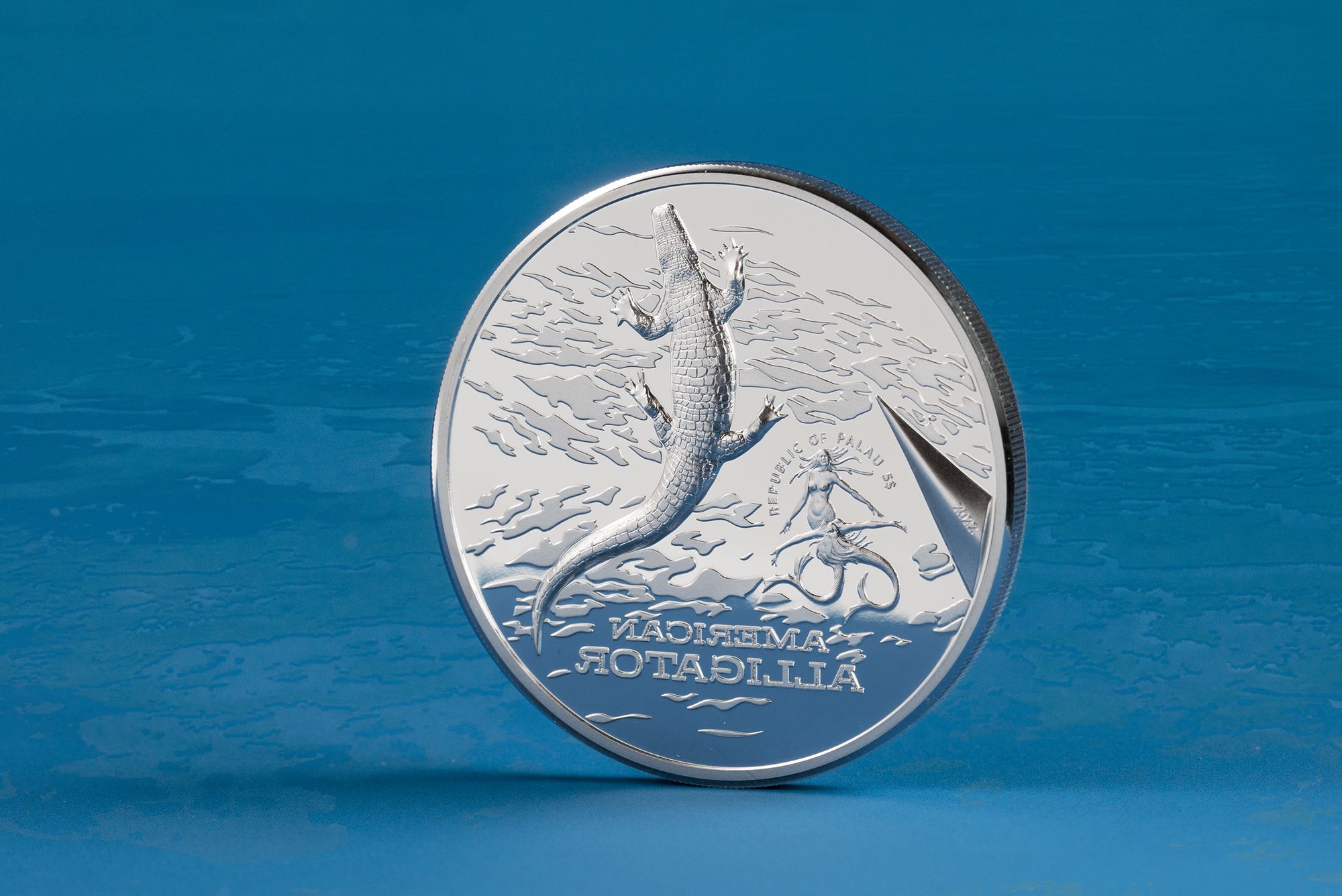 The American alligator floats lazily down the river next to a...fisherman's hat? Guess somebody got a little too close! On this 1 ounce silver coin enjoy a bird's eye view of the American alligator, and a fish eye view as well from beneath the creature on the obverse of the coin. Warning: beware the alligator!