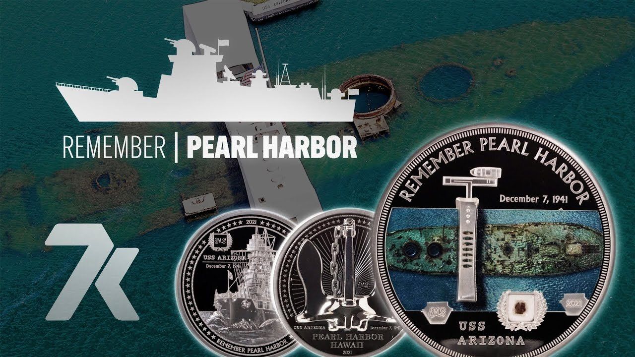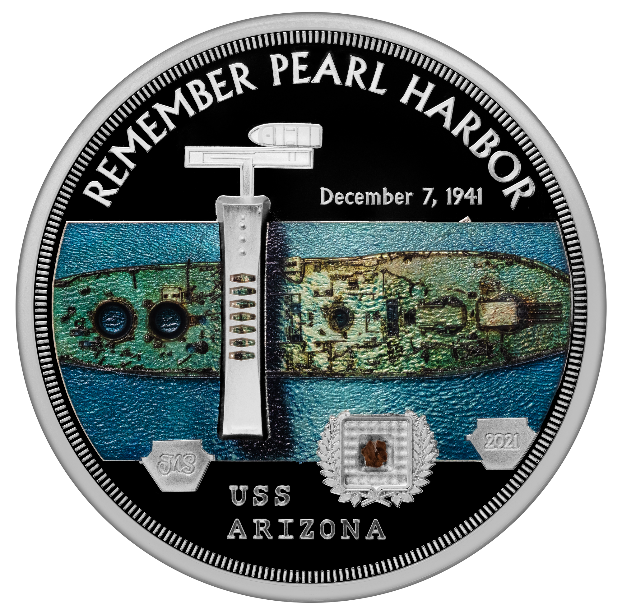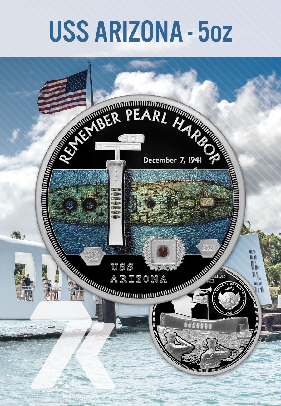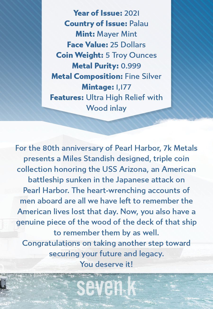 For the 80th anniversary of Pearl Harbor, 7k Metals presents a Miles Standish designed, triple coin collection honoring the USS Arizona, an American battleship sunken in the Japanese attack on Pearl Harbor. The heart-wrenching accounts of men aboard are all we have left to remember the American lives lost that day. Now, you also have a genuine piece of the wood of the deck of that ship to remember them by as well.