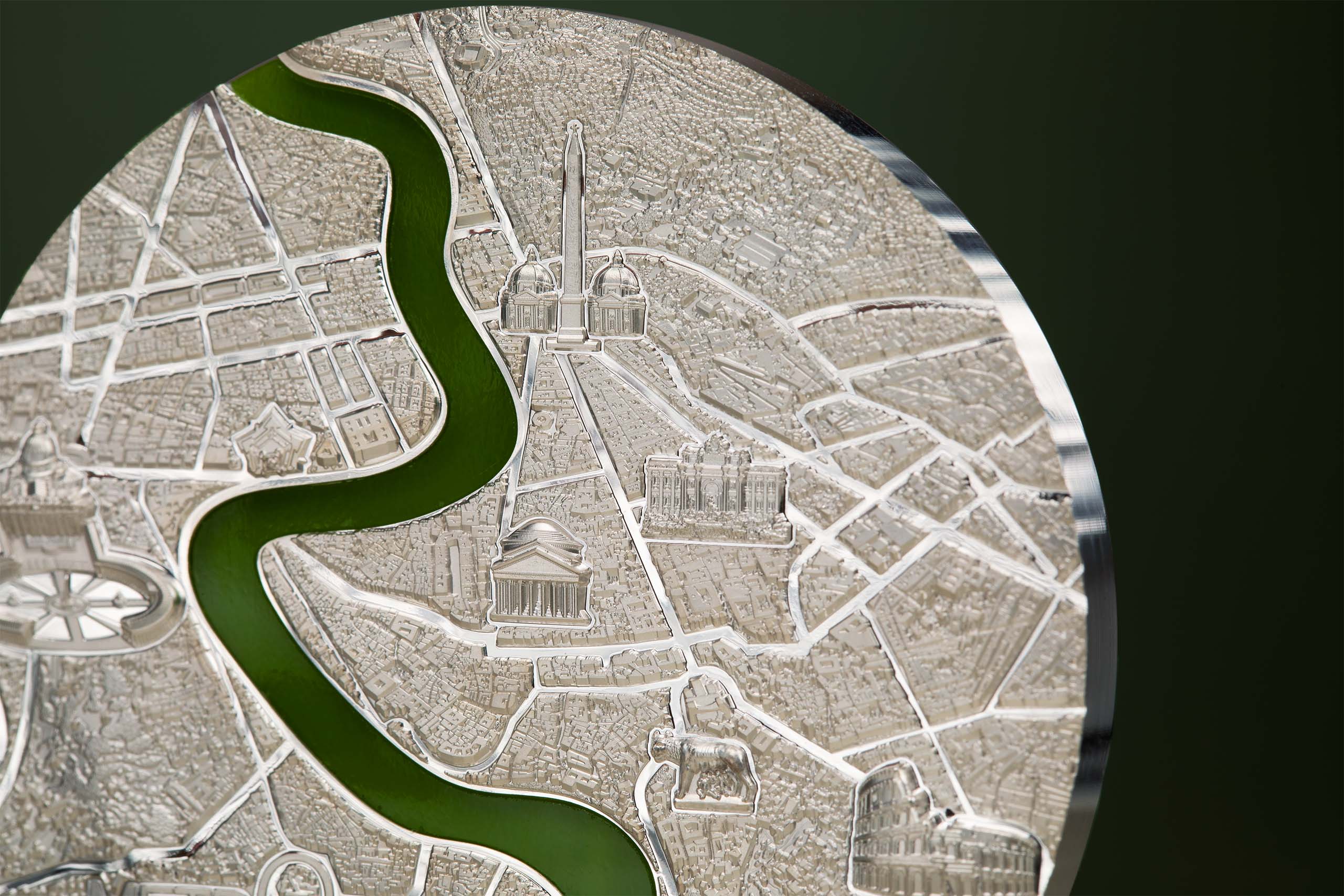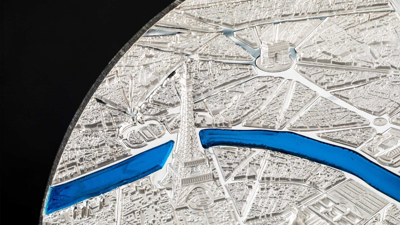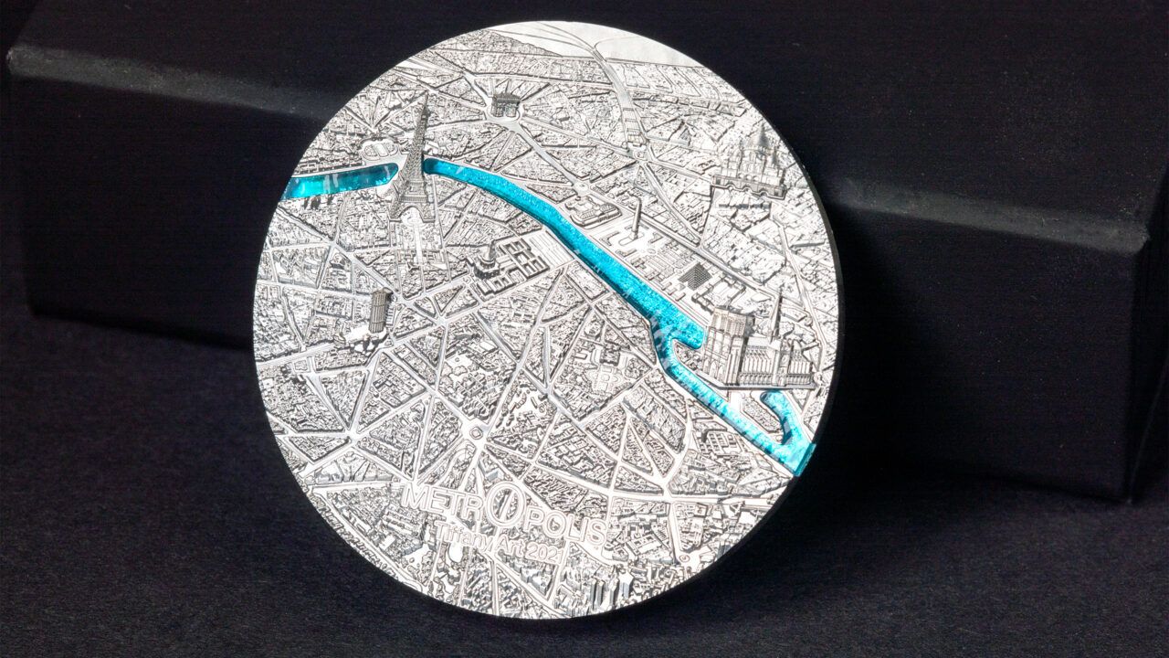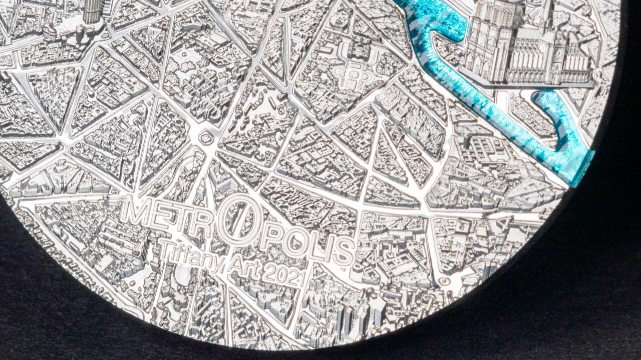 The Tiffany Art series just keeps getting better! Now they’ve outdone themselves with the latest release, Metropolis – Paris. Lose yourself in the bird’s eye view of the “City of Love” ornately engraved on the reverse. World-famous landmarks come alive, including the Tiffany-series signature glass inlay of the River Seine. The way the glass appears to divide the coin in half is a ground-breaking achievement of numismatic technology!