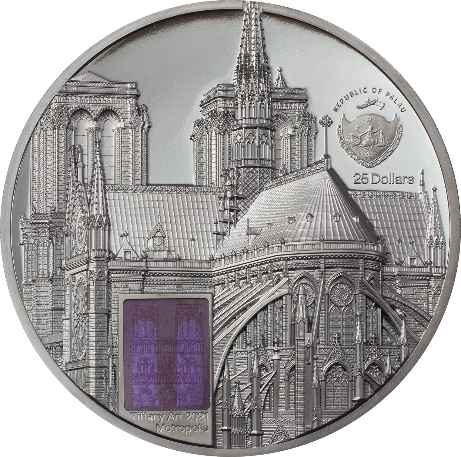 This “Tiffany Art Metropolis” 5 ounce silver special is a show stopper for sure. Within a collection that celebrates cities all over the world and their famous architecture, the bell tower of Notre Dame demands to be seen! It has not only inspired stories of hunchbacks and gypsies, but it's become a cultural staple of the city of Paris. And as always, enjoy the authentic Tiffany stained glass windows!