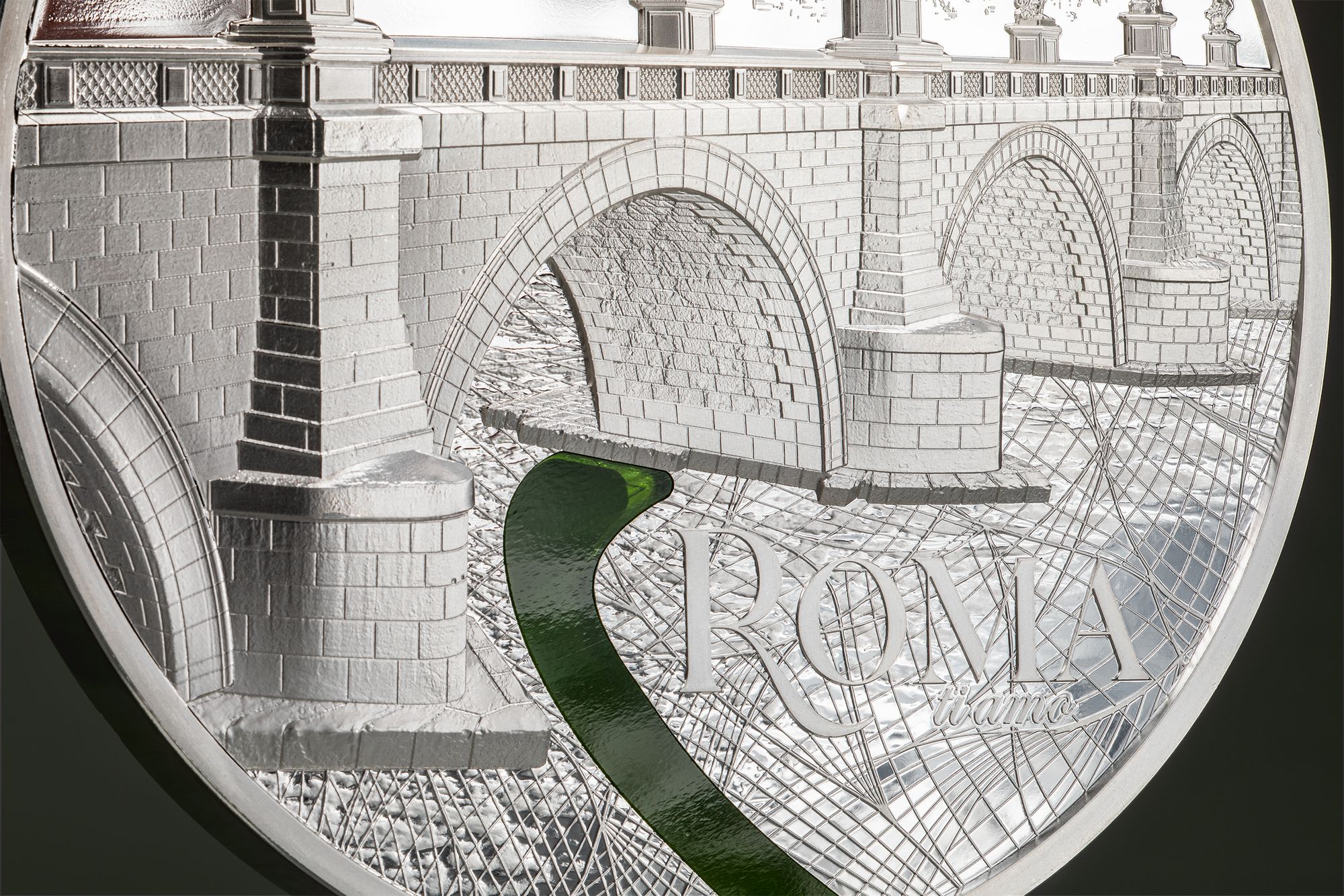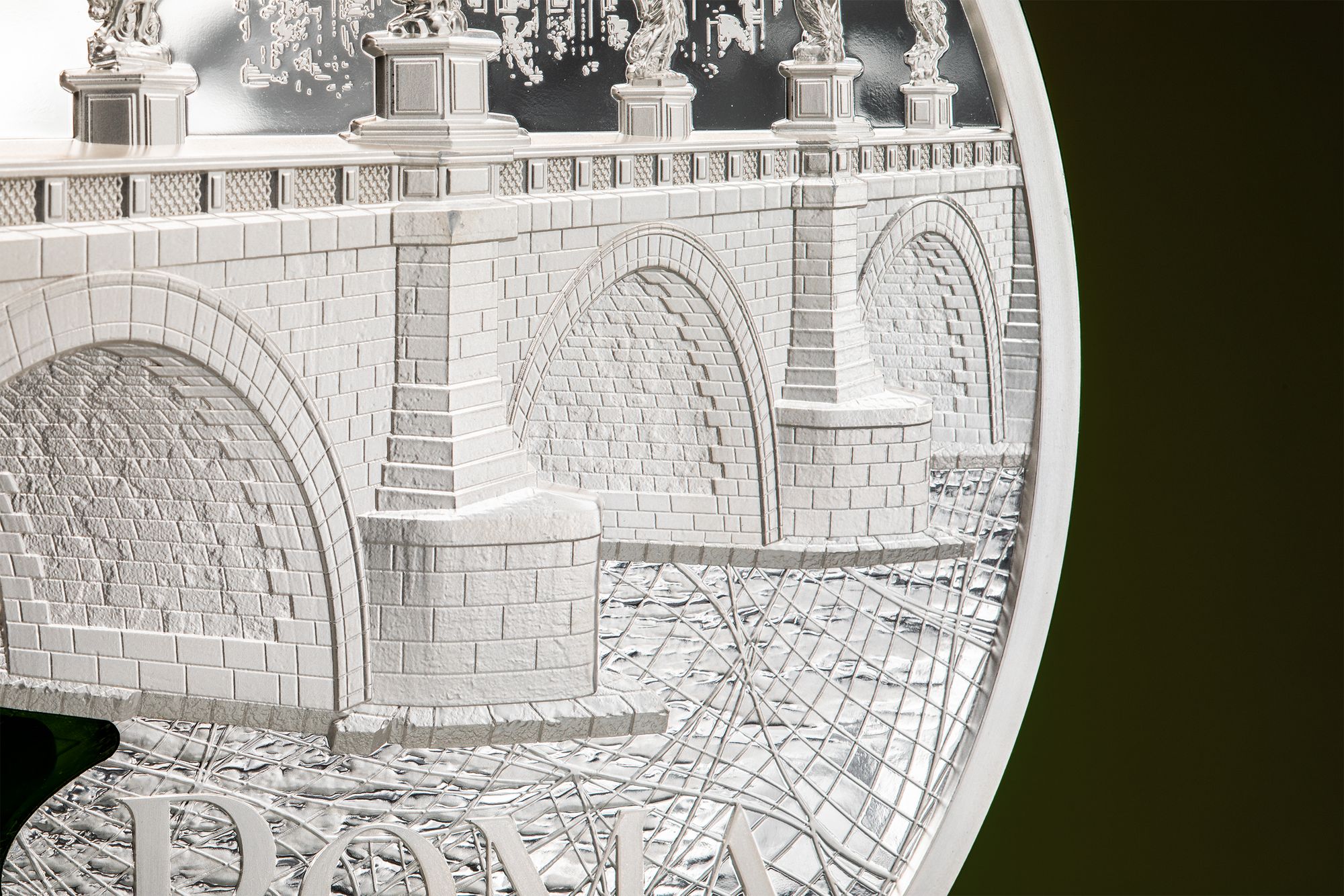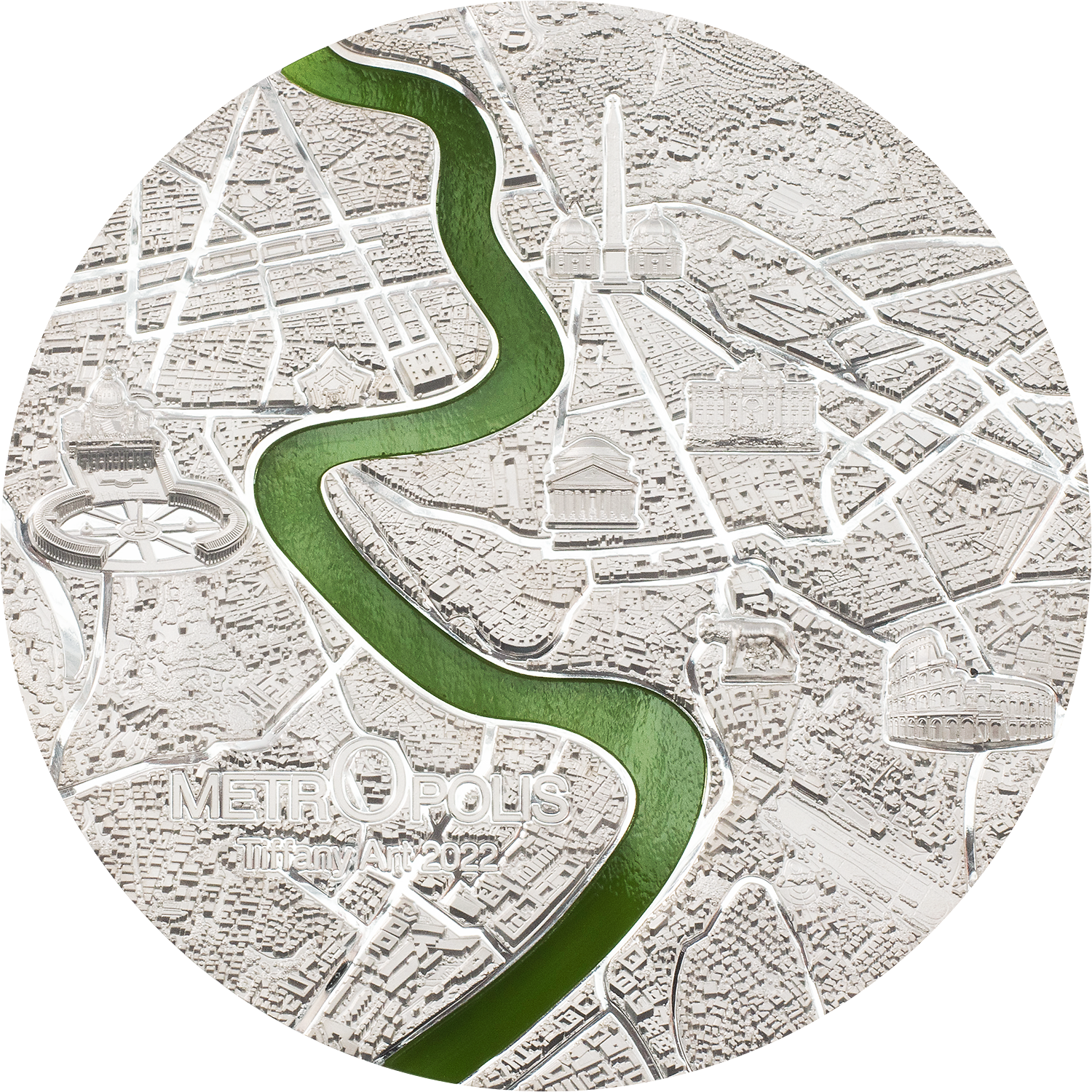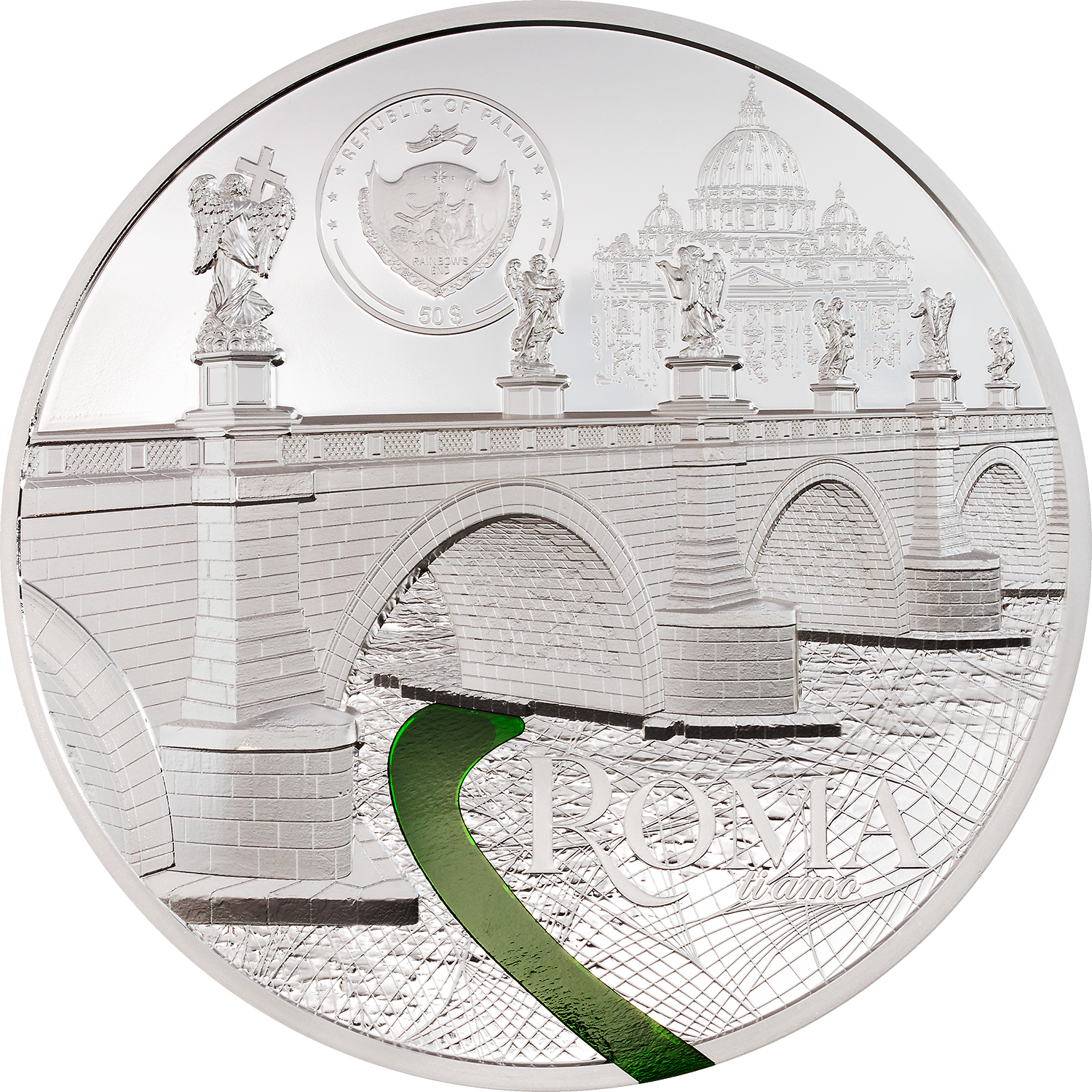 Rome, the city of the Colosseum, the Vatican, the Pantheon, and many of the world's oldest man-made wonders. This silver kilo replica of "Rome" is the newest addition to the 'Tiffany Art Metropolis' collection, and allows a bird's eye view of the city. This treasure of course features classic Tiffany stained glass in emerald green on both sides of this impressive coin! The obverse shows another famous Roman structure: the Ponte Sant' Angelo, the Bridge of Angels.
