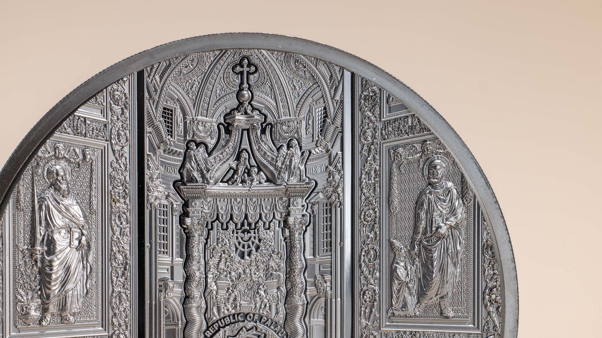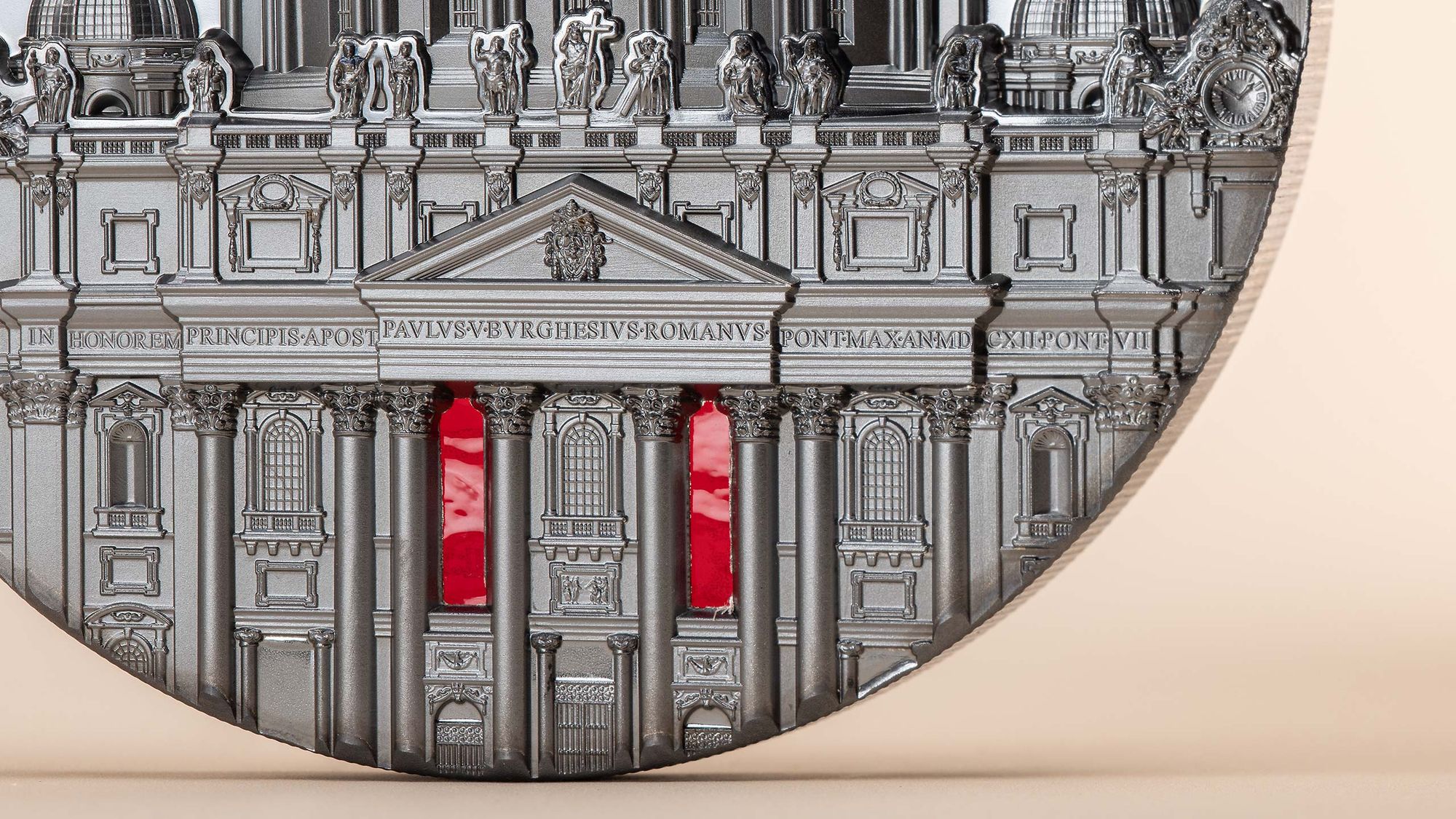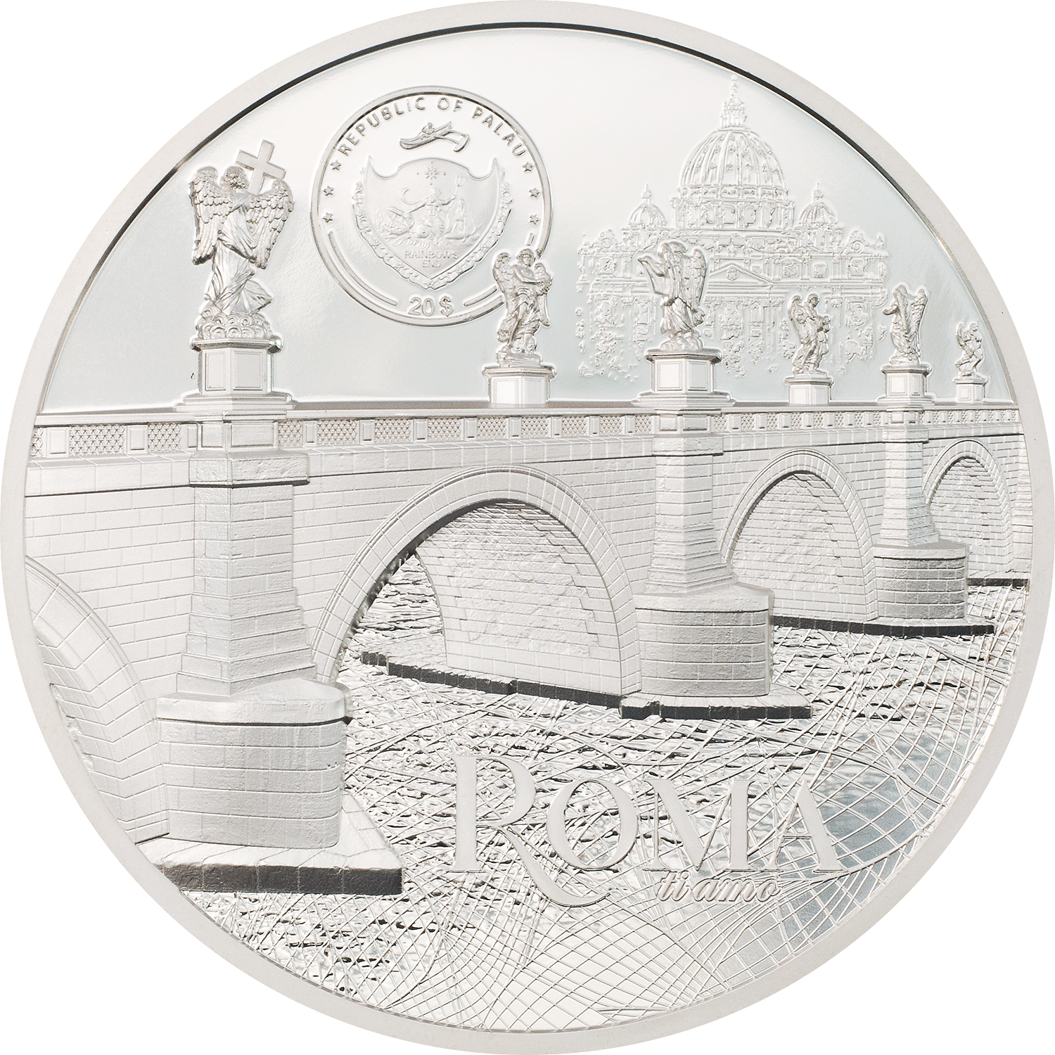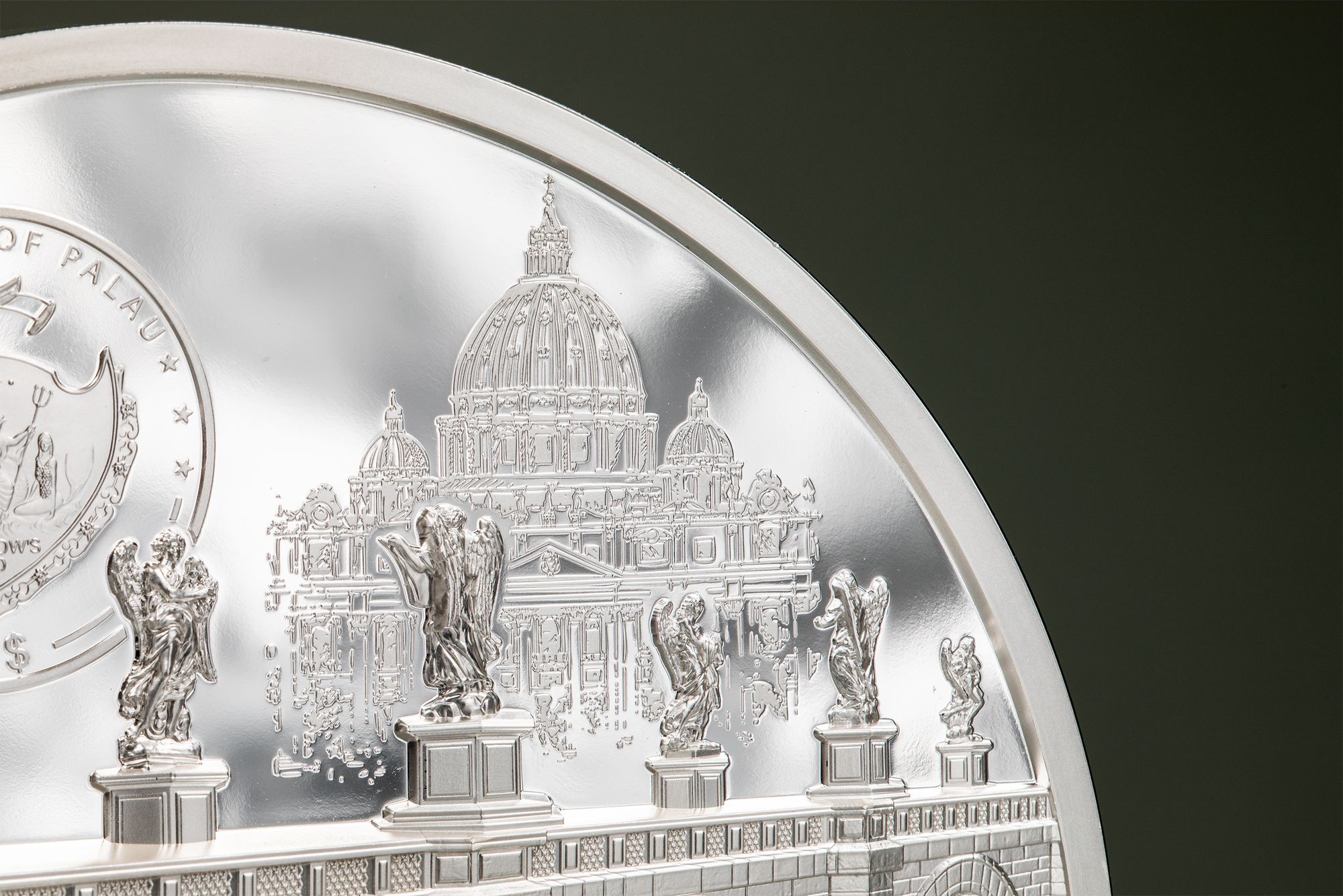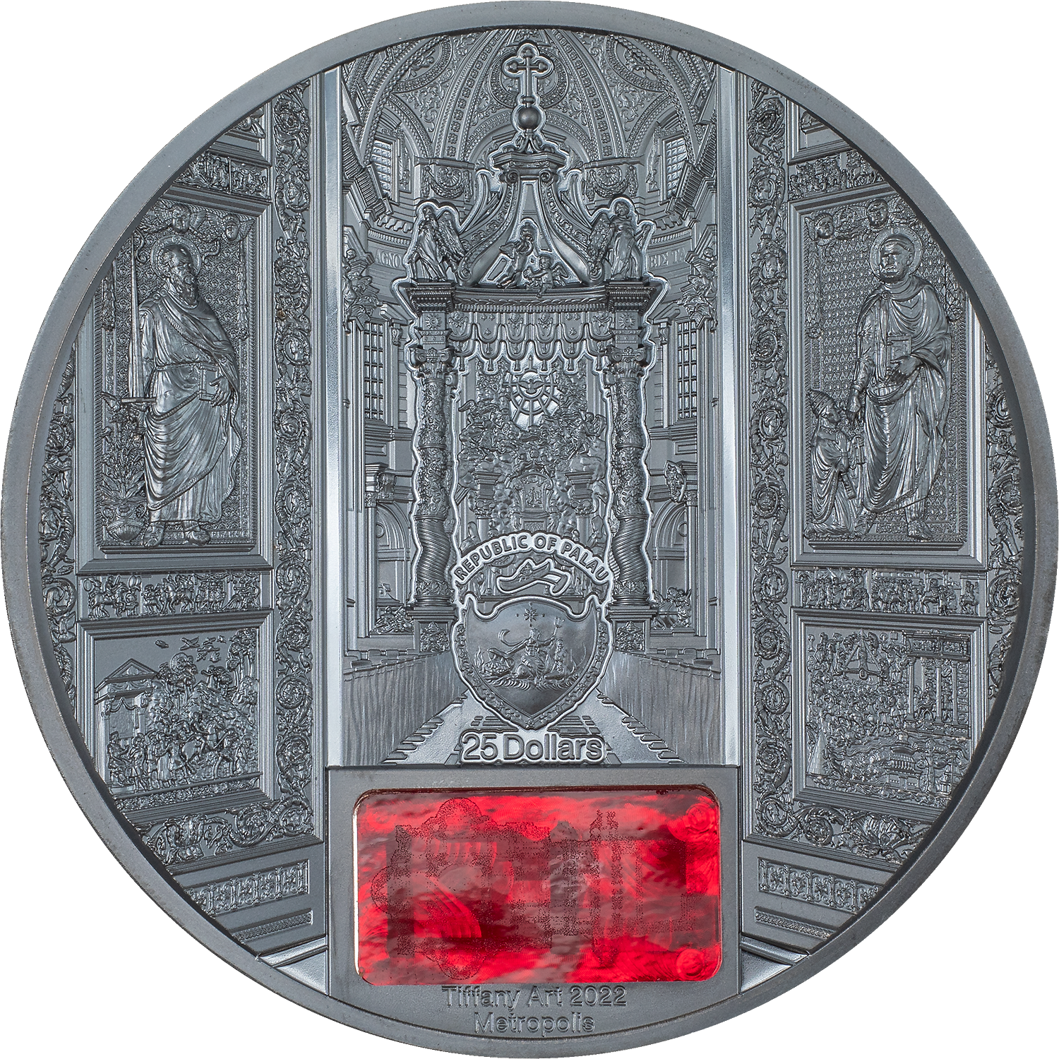 Rome, the city of the Colosseum, the Vatican, the Pantheon, and many of the world's oldest man-made wonders. This silver kilo replica of "Rome" is the newest addition to the 'Tiffany Art Metropolis' collection, and allows a bird's eye view of the city. This treasure of course features classic Tiffany stained glass in emerald green on both sides of this impressive coin! The obverse shows another famous Roman structure: the Ponte Sant' Angelo, the Bridge of Angels.