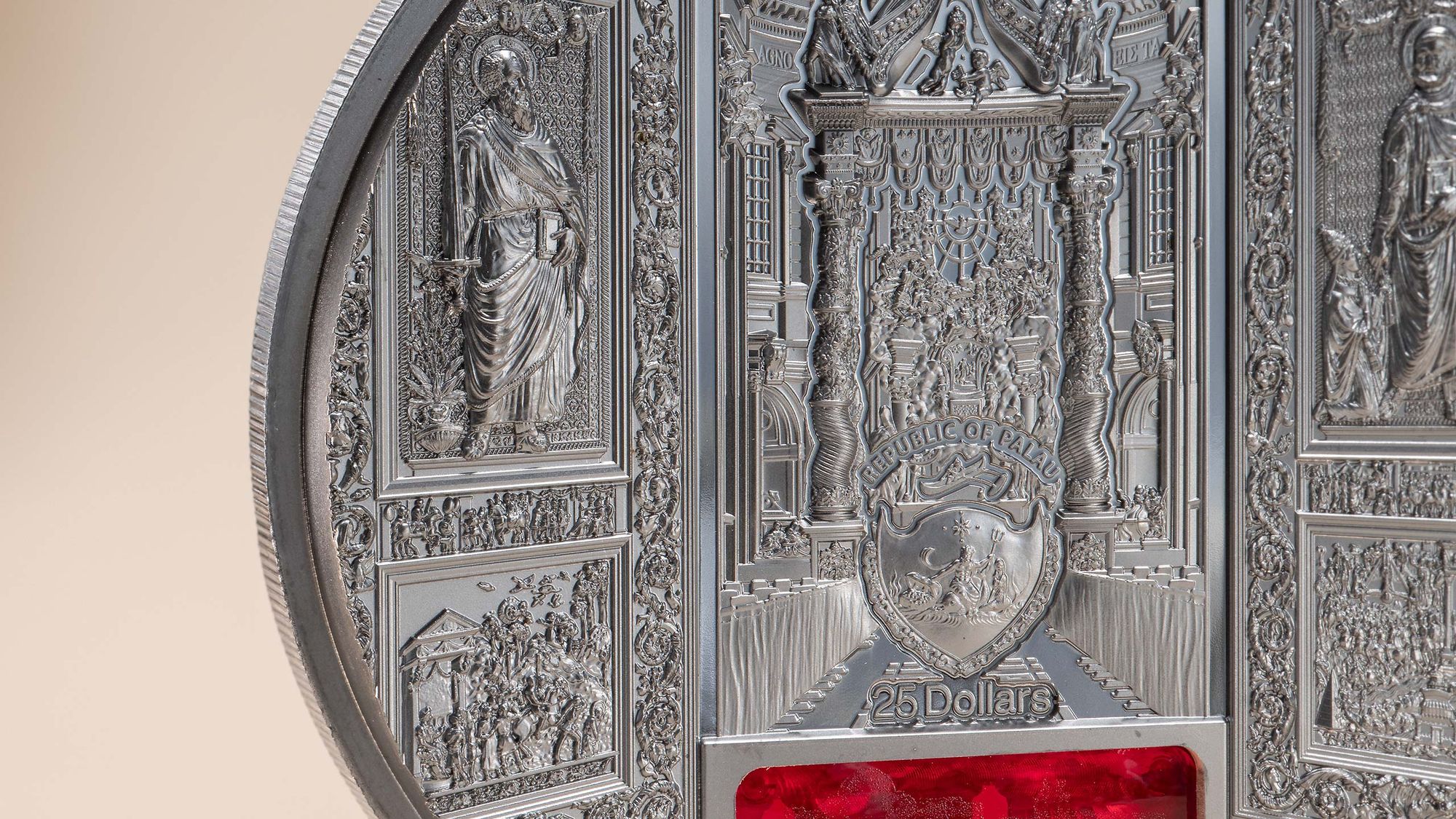 Rome, the city of the Colosseum, the Vatican, the Pantheon, and many of the world's oldest man-made wonders. This 3-ounce edition of "Rome" is the newest addition to the 'Tiffany Art Metropolis' collection, and allows a bird's eye view of the city. This treasure of course features classic Tiffany stained glass in emerald green on both sides of this impressive coin! The obverse shows another famous Roman structure: the Ponte Sant' Angelo, the Bridge of Angels.