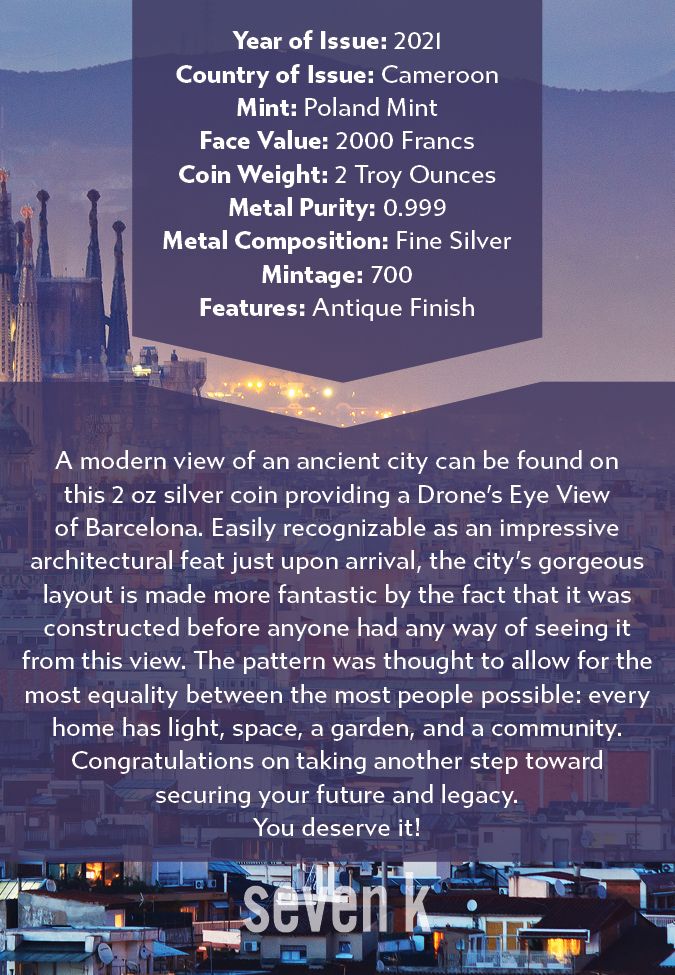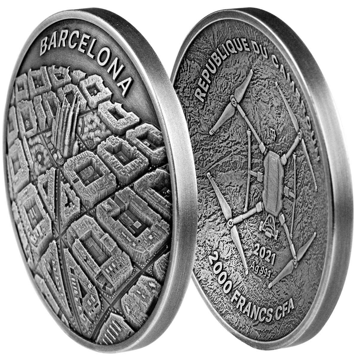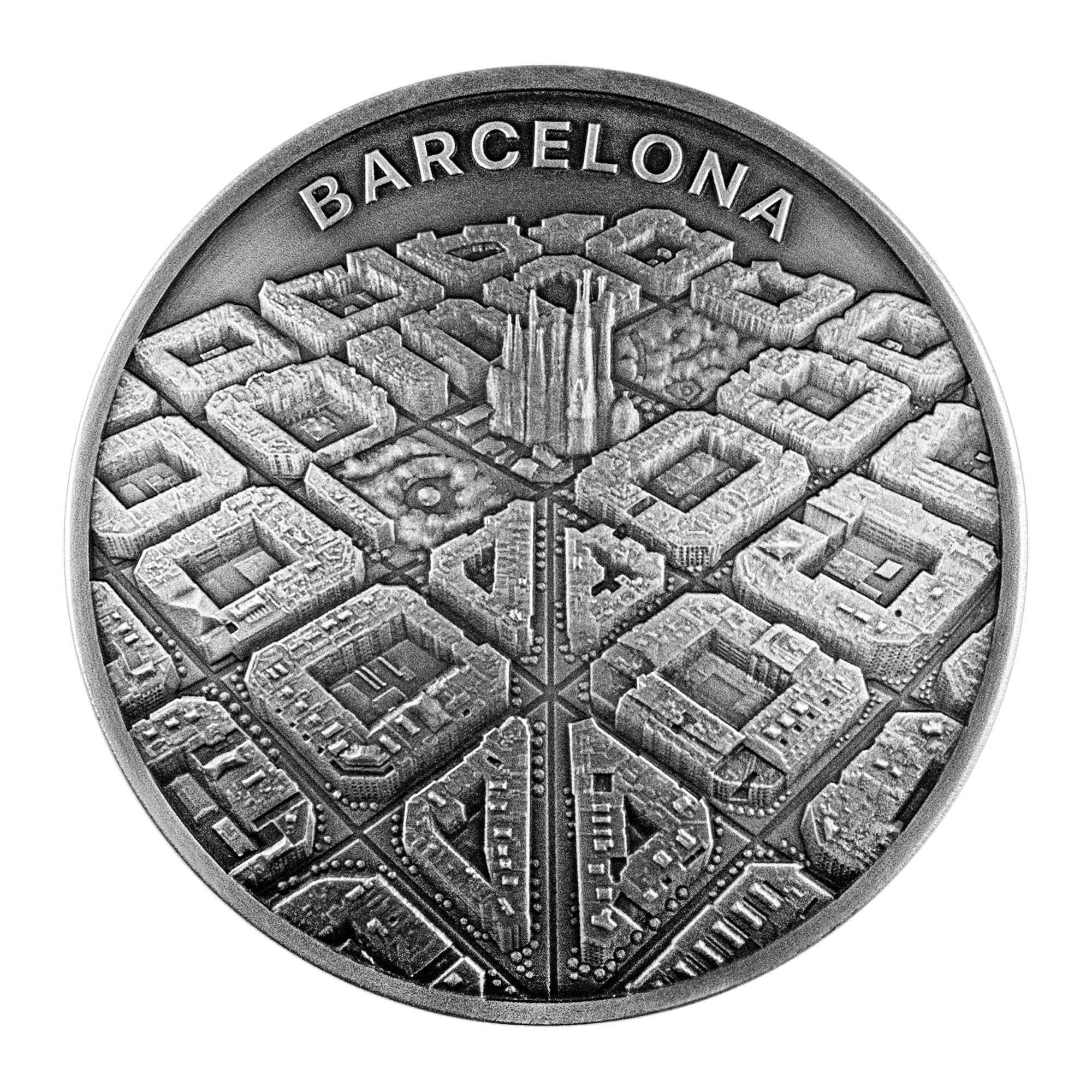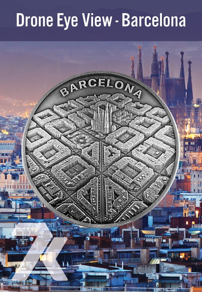 A modern view of an ancient city can be found on this 2 oz silver coin providing a Drone's Eye View of Barcelona. Easily recognizable as an impressive architectural feat just upon arrival, the city's gorgeous layout is made more fantastic by the fact that it was constructed before anyone had any way of seeing it from this view. The pattern was thought to allow for the most equality between the most people possible: every home has light, space, a garden, and a community.