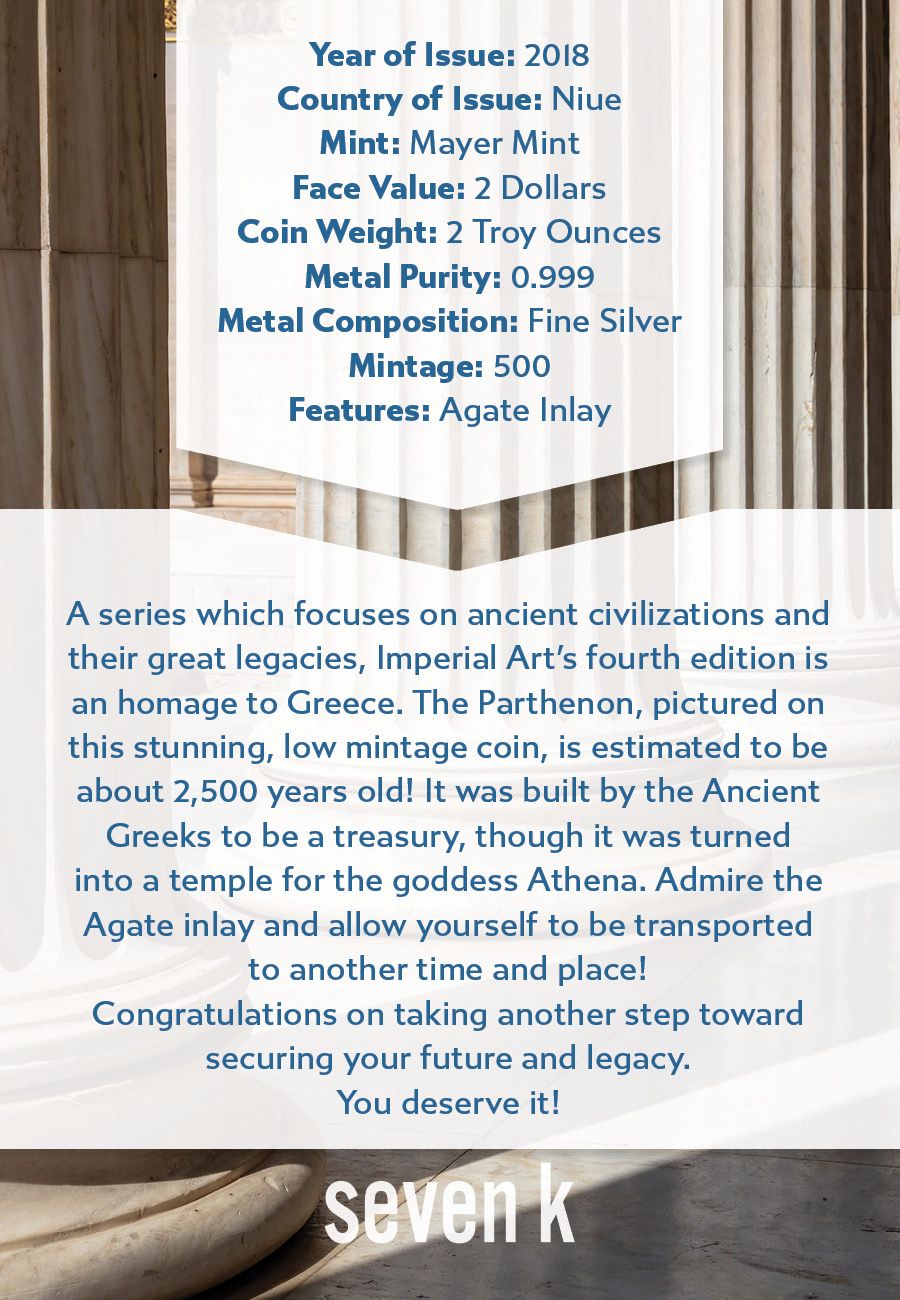 A series which focuses on ancient civilizations and their great legacies, Imperial Art's fourth edition is an homage to Greece. The Parthenon, pictured on this stunning, low mintage coin, is estimated to be about 2,500 years old! It was built by the Ancient Greeks to be a treasury, though it was turned into a temple for the goddess Athena. Admire the Agate inlay and allow yourself to be transported to another time and place!