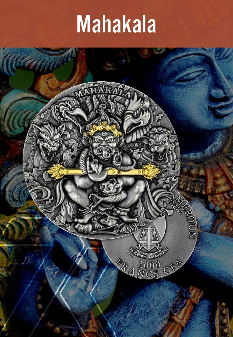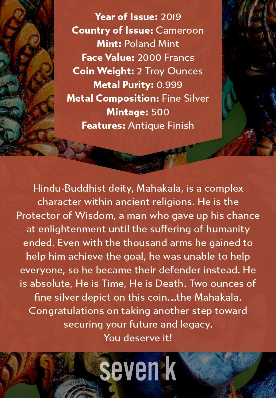 Hindu-Buddhist deity, Mahakala, is a complex character within ancient religions. He is the Protector of Wisdom, a man who gave up his chance at enlightenment until the suffering of humanity ended. Even with the thousand arms he gained to help him achieve the goal, he was unable to help everyone, so he became their defender instead. He is absolute, He is Time, He is Death. Two ounces of fine silver depict on this coin… the Mahakala.