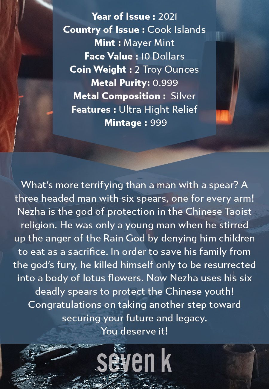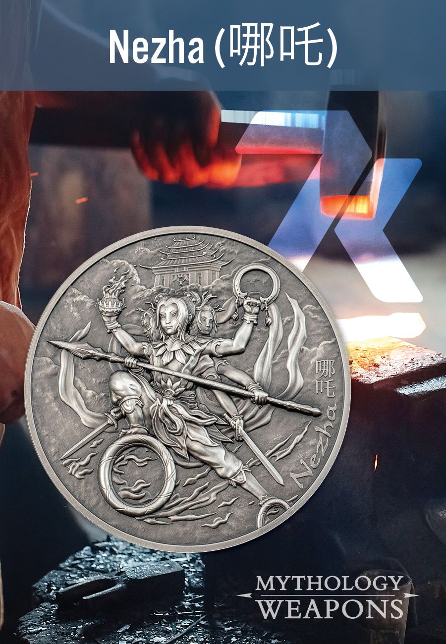 What's more terrifying than a man with a spear? A three headed man with six spears, one for every arm! Nezha is the god of protection in the Chinese Taoist religion. He was only a young man when he stirred up the anger of the Rain God by denying him children to eat as a sacrifice. In order to save his family from the god's fury, he killed himself only to be resurrected into a body of lotus flowers. Now Nezha uses his six deadly spears to protect the Chinese youth! This is the 5th and final coin in the Mythology Weapons series.