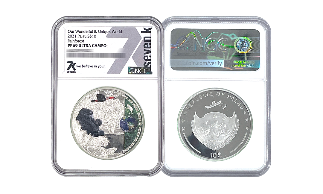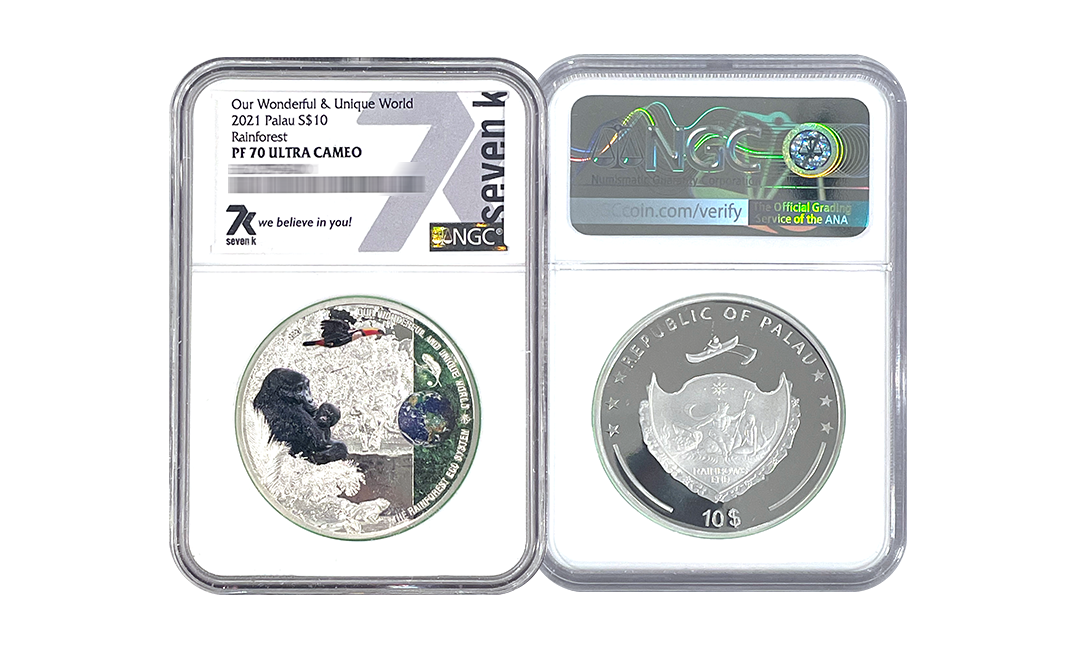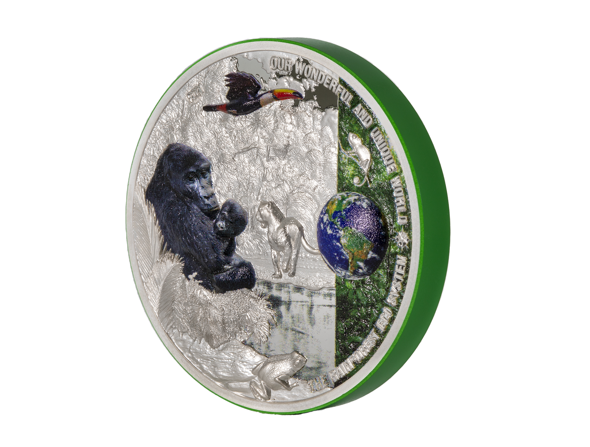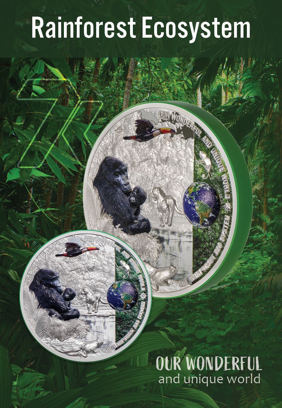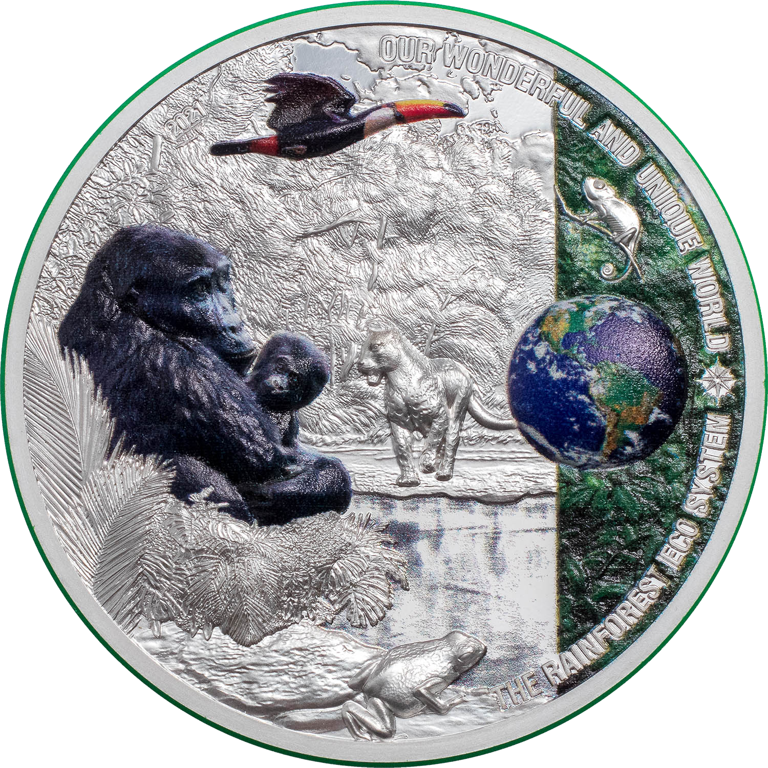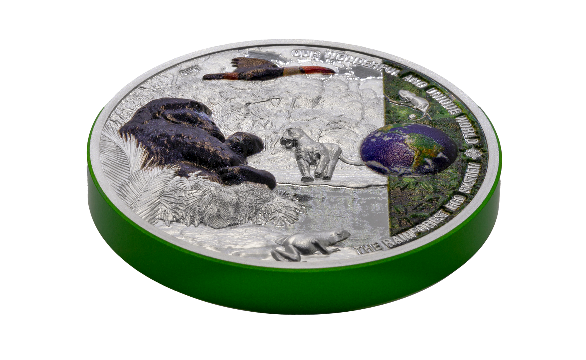 Check out the unique green colored edge on this beautiful coin! The Rainforest Ecosystem coin is the second issue in the "Our Wonderful & Unique World" series and pays homage to the world's rainforests and the incredible creatures who call them home. Look closely and you'll see gorillas from the African rainforest, the Toucan and Jaguar from the Amazon, and others. Only 499 minted worldwide!