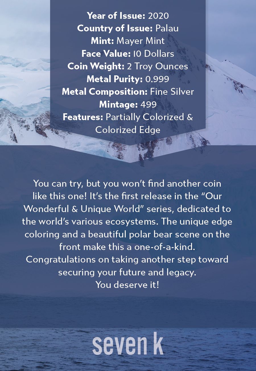 You can try, but you won't find another coin like this one! It's the first release in the "Our Wonderful & Unique World" series, dedicated to the world's various ecosystems. The unique edge coloring and a beautiful polar bear scene on the front make this a one-of-a-kind.