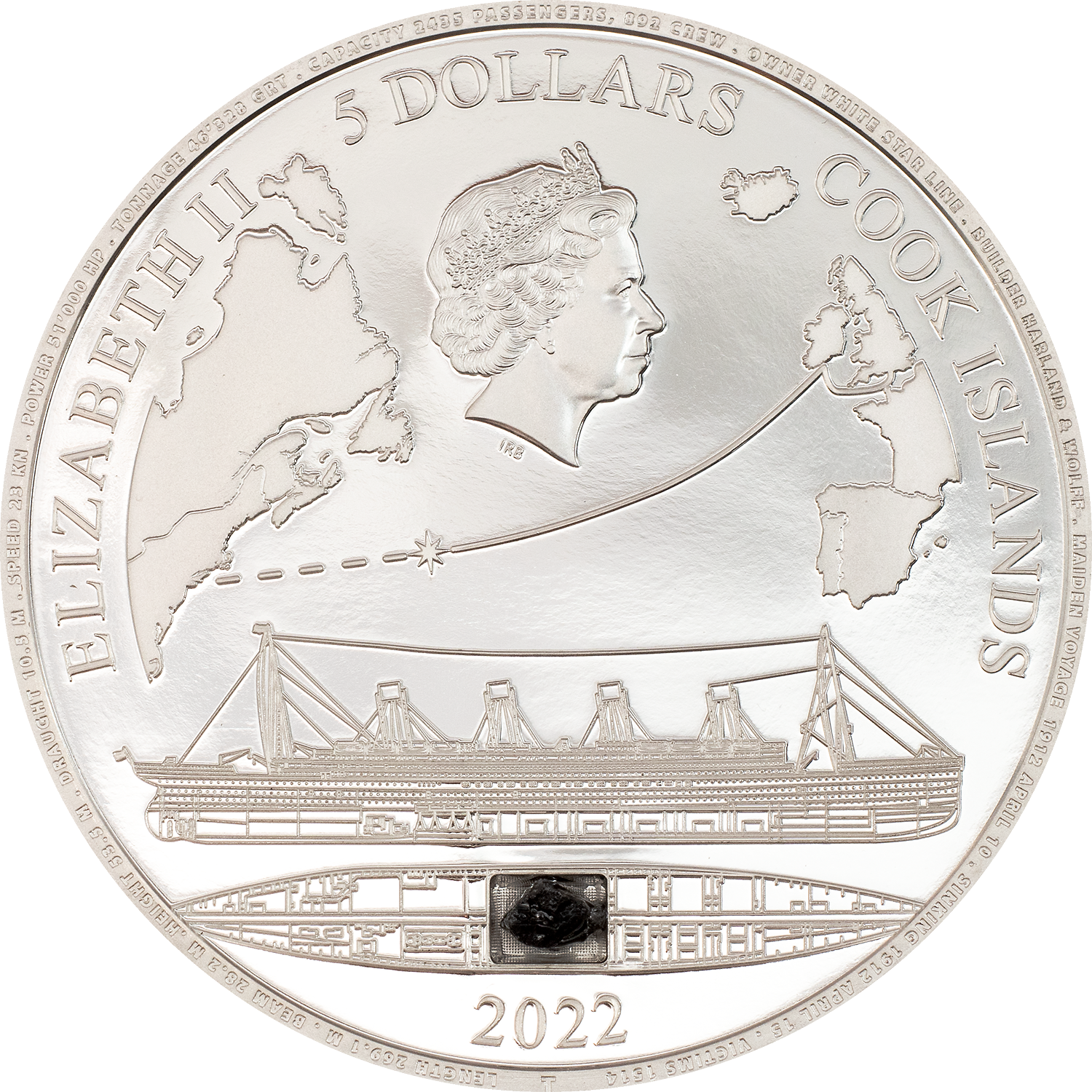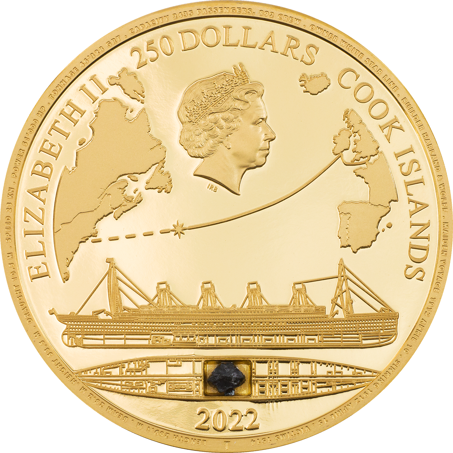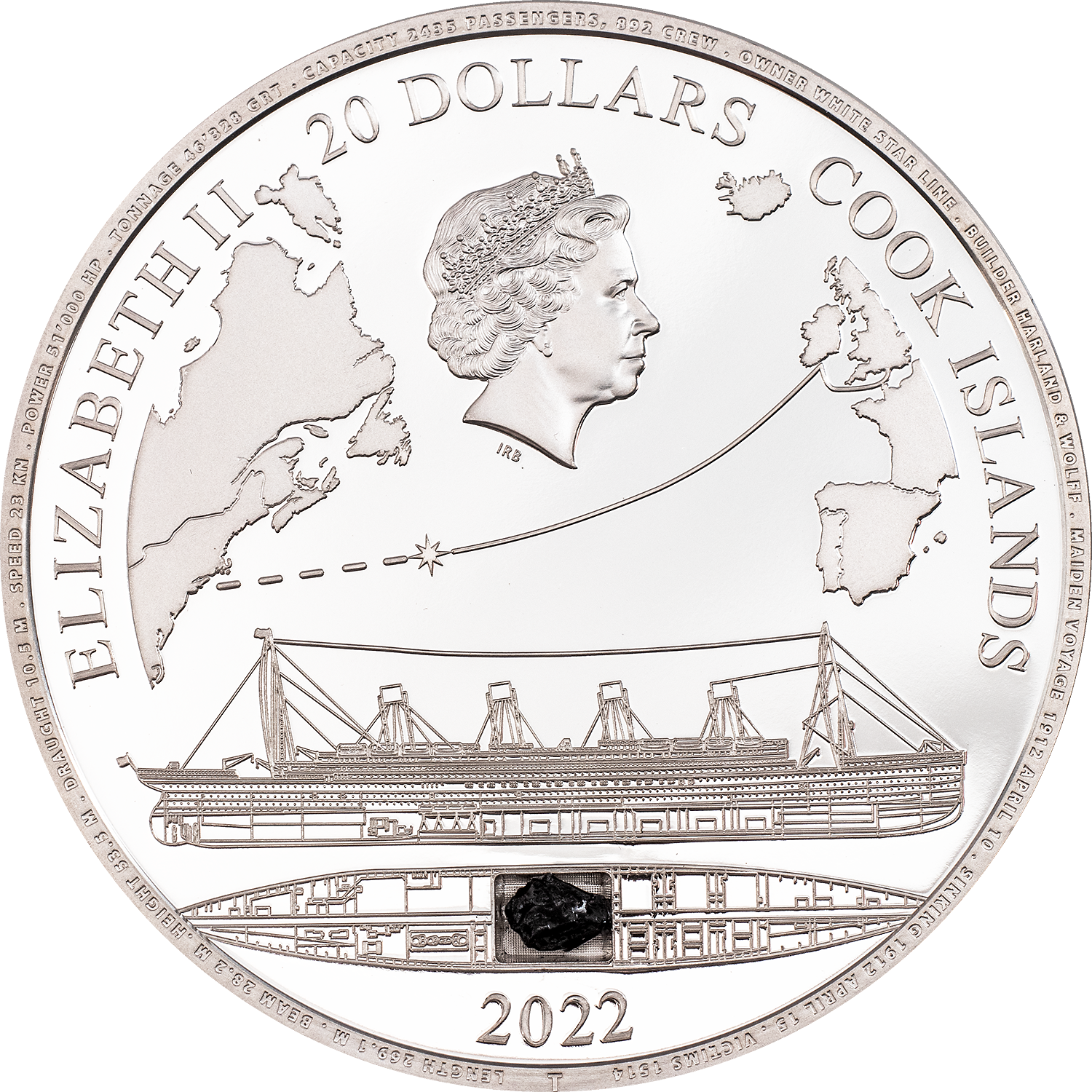 Just a handful of artifacts from the Titanic have made it back to the water surface as the ship lies at a depth of 3800 m (12470 ft.) at the bottom of the sea. One of them is an authentic coal lump which was recovered back in 2000. This would have been used to power its massive steam engines. A certified piece of it is integrated into these coins! There will be a total of 5 different coins done in 3 metals. With this coin honoring the Titanic you get yourself a special relic of this historic event.