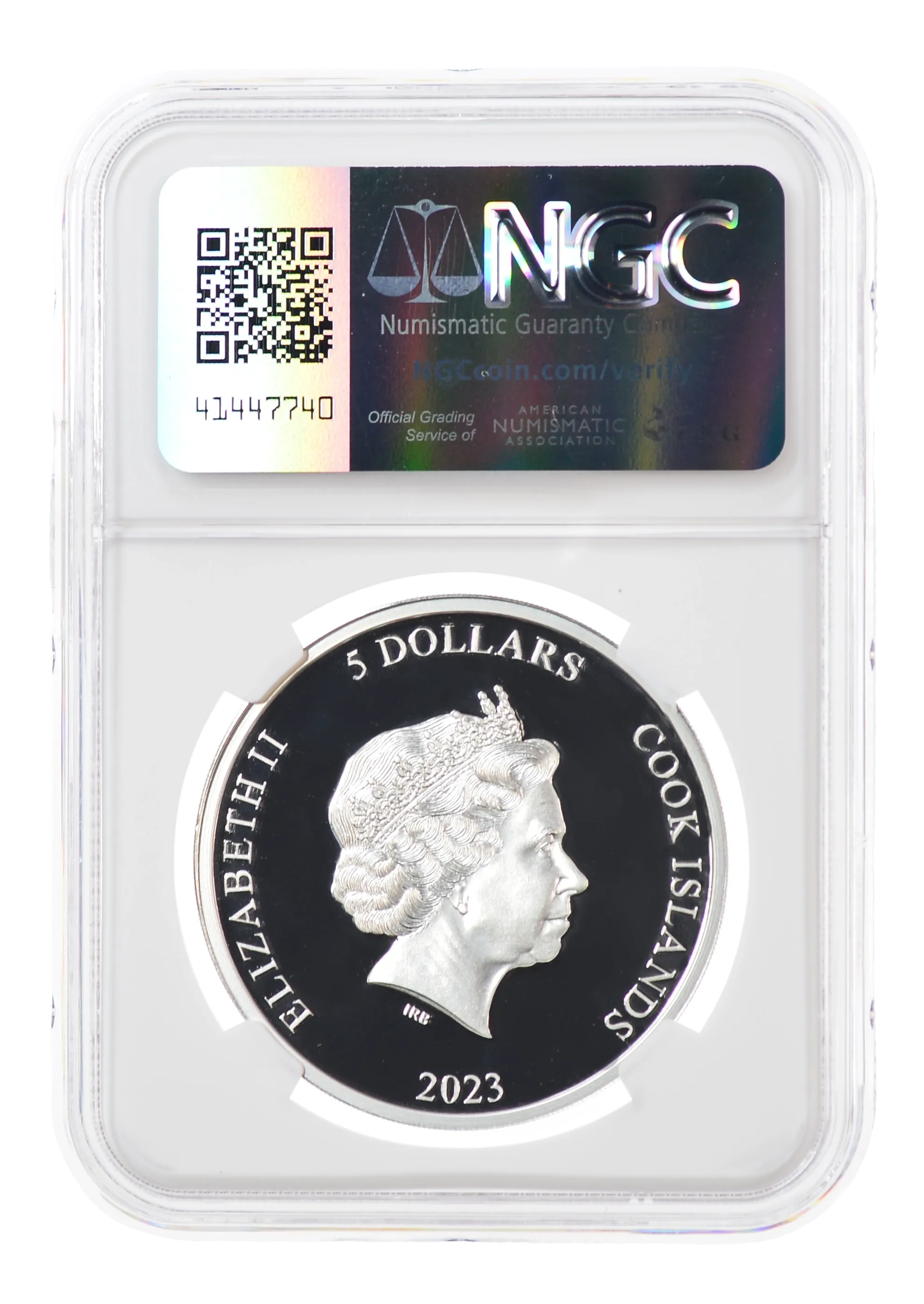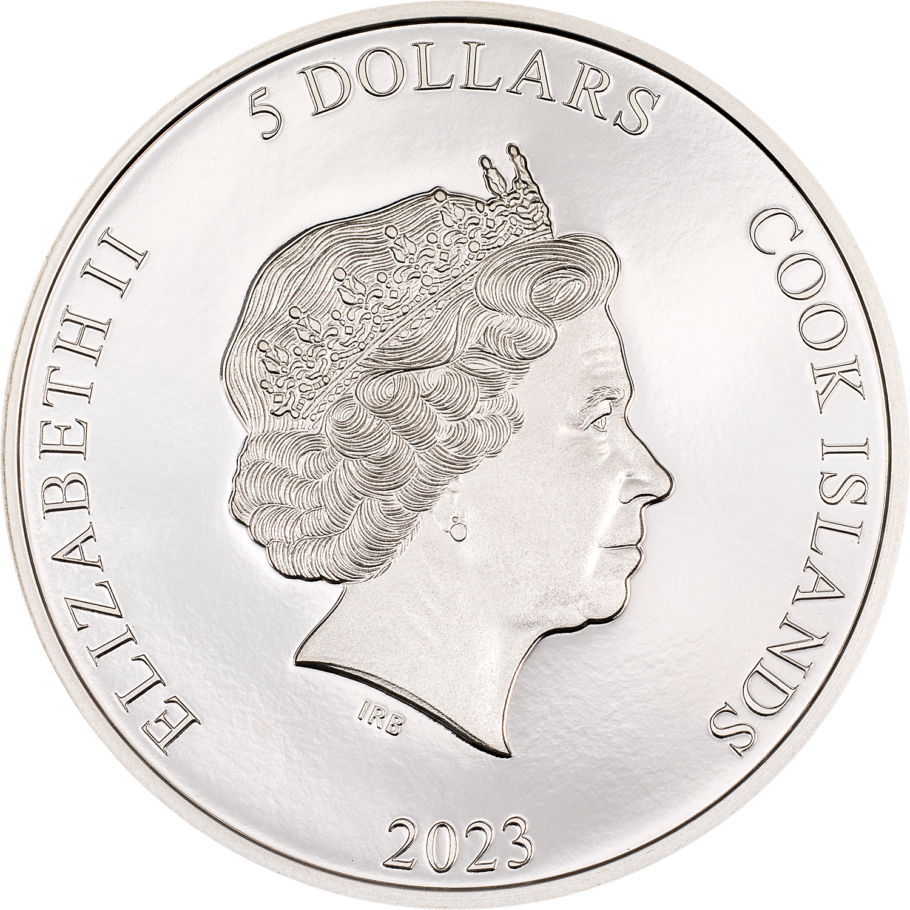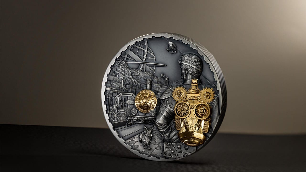 If there’s a future with jet packs, count us in! This hefty kilo coin joins the Steampunk collection in its artistic renderings of a world where Victorian-cyborg is the future. Just look at all the options for transportation: a penny-farther, a train, suspended streetcars, even a jet pack. Plus, look at that bionic corgi with an eyepatch. Now that’s a good boy.